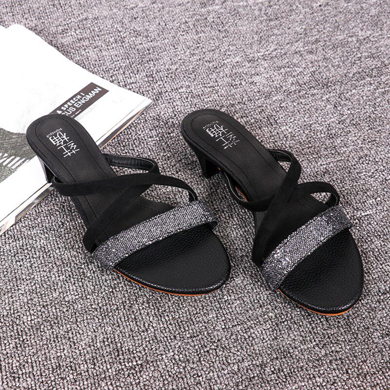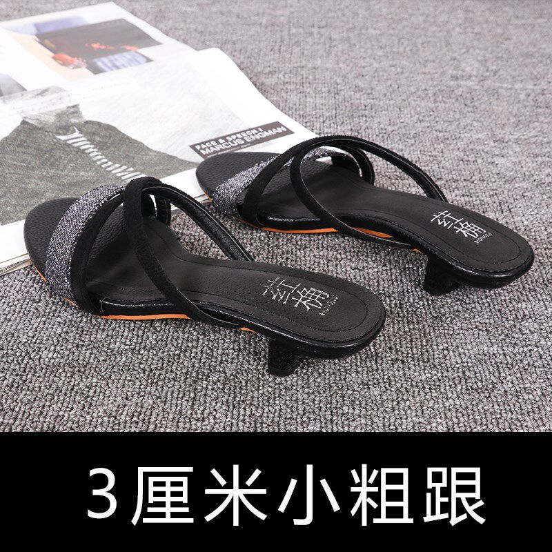 简约3cm低跟凉拖女外穿J黑色粗跟亮片一字型露趾拖鞋 2021夏季 新款