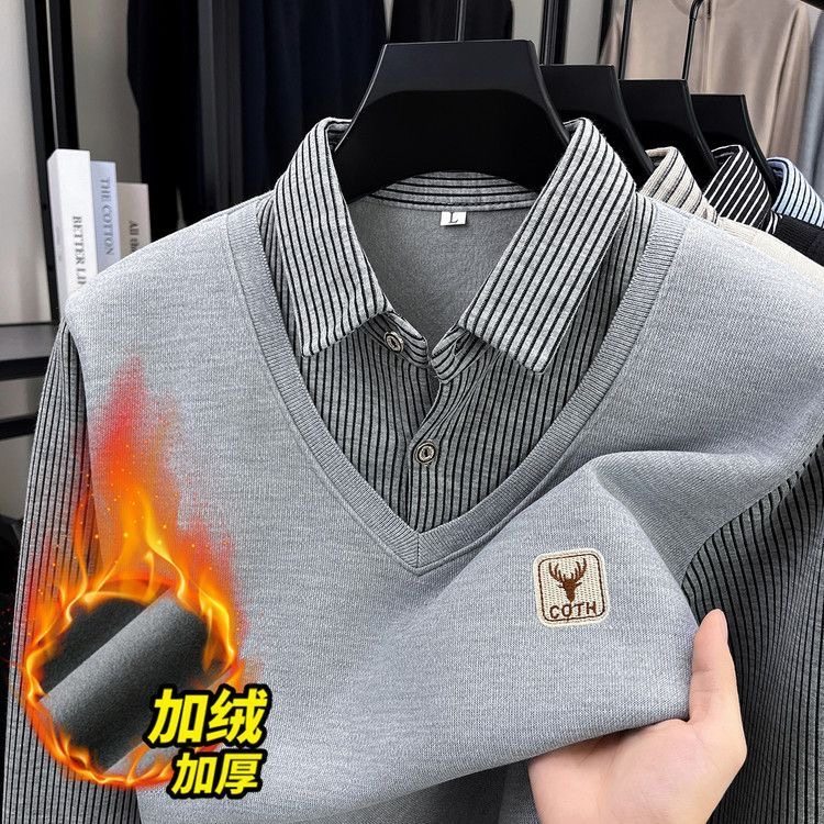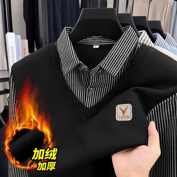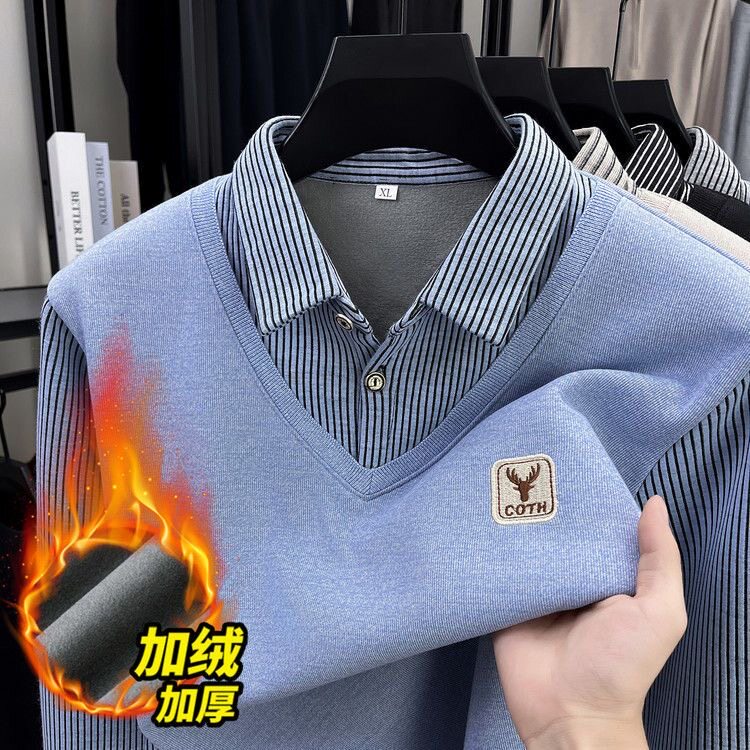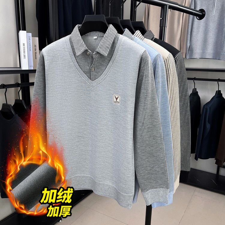 内搭针织打底衫 领毛衣男士 加绒加厚带领保暖线衣 假两件衬衫 秋冬季