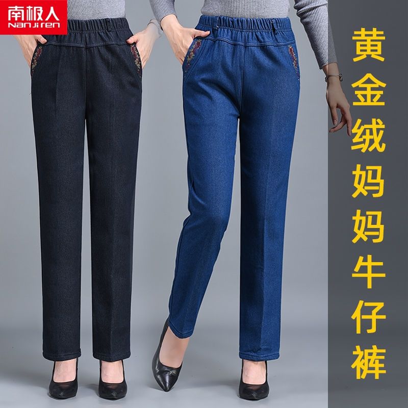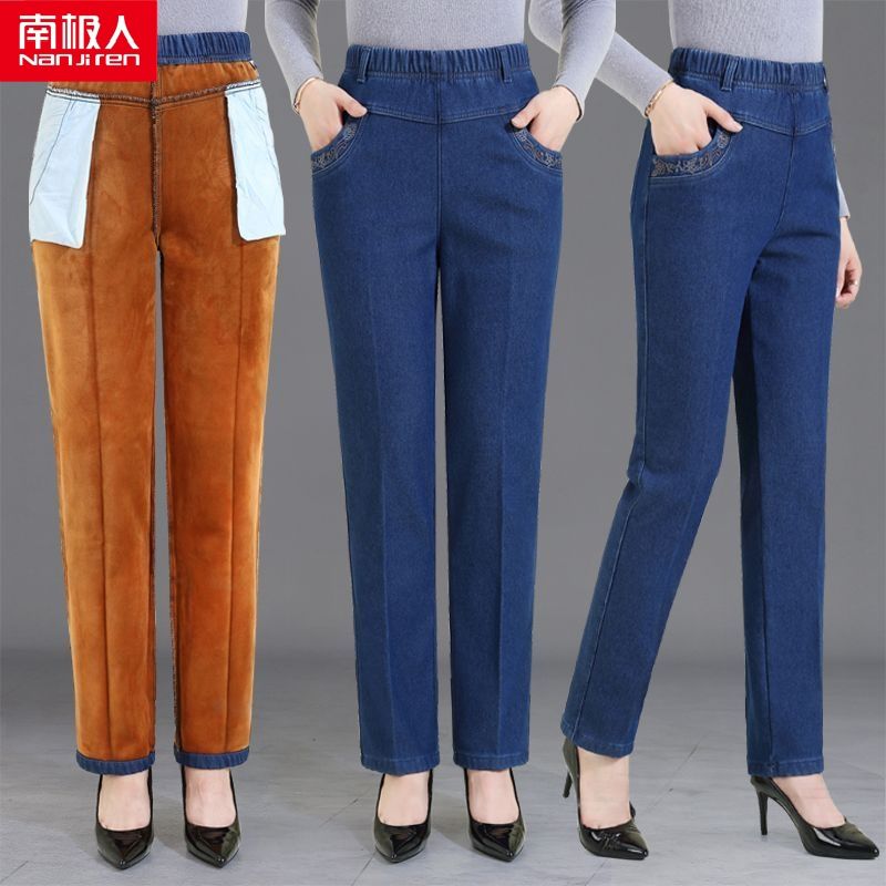 松紧高腰裤 南极人女士冬季 休闲裤 妈妈加绒加厚直筒大码 加绒牛仔裤