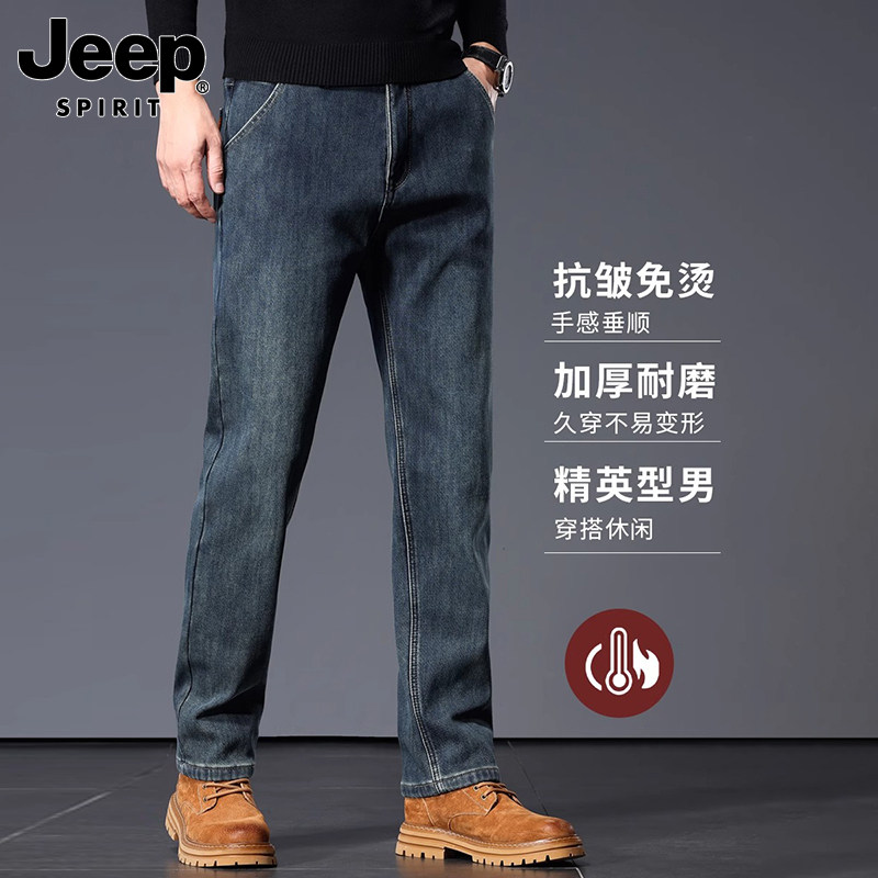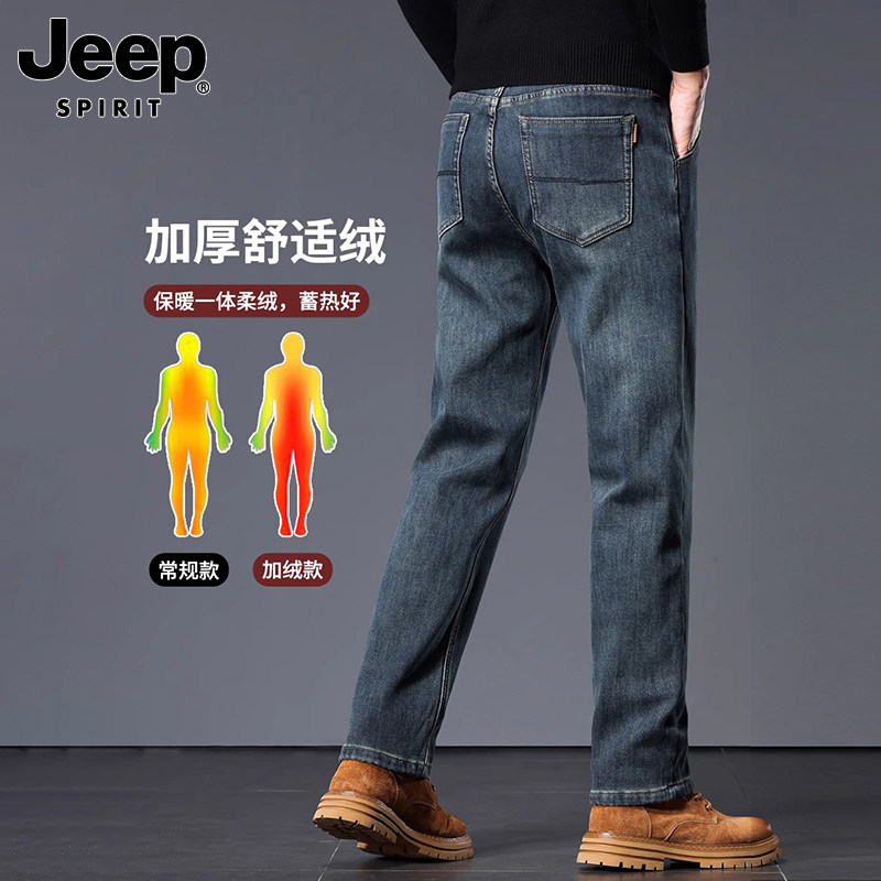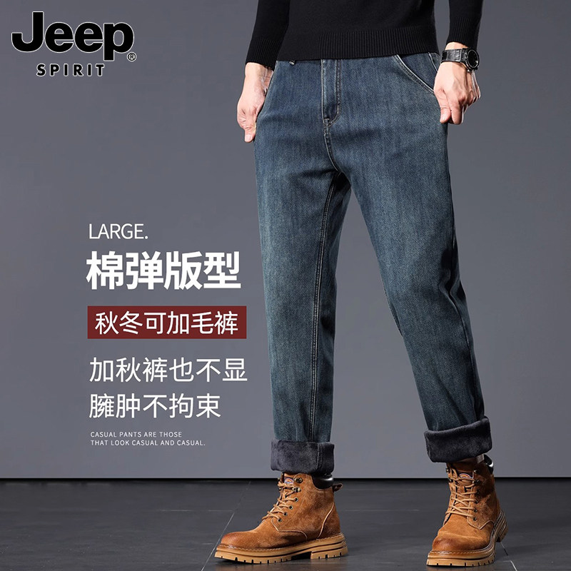 新款 复古商务高端长裤 加绒保暖牛仔裤 宽松大码 子 男款 JEEP吉普冬季