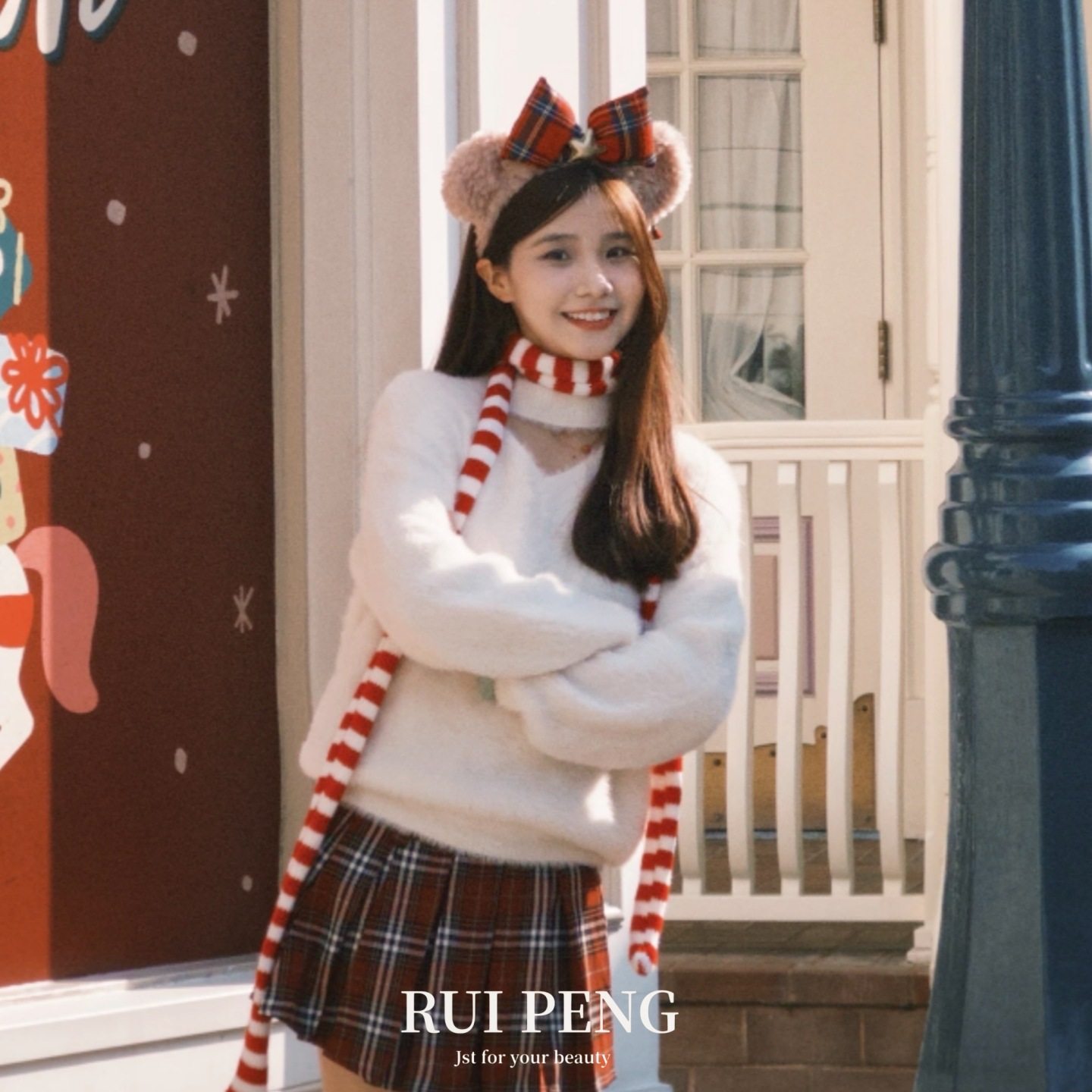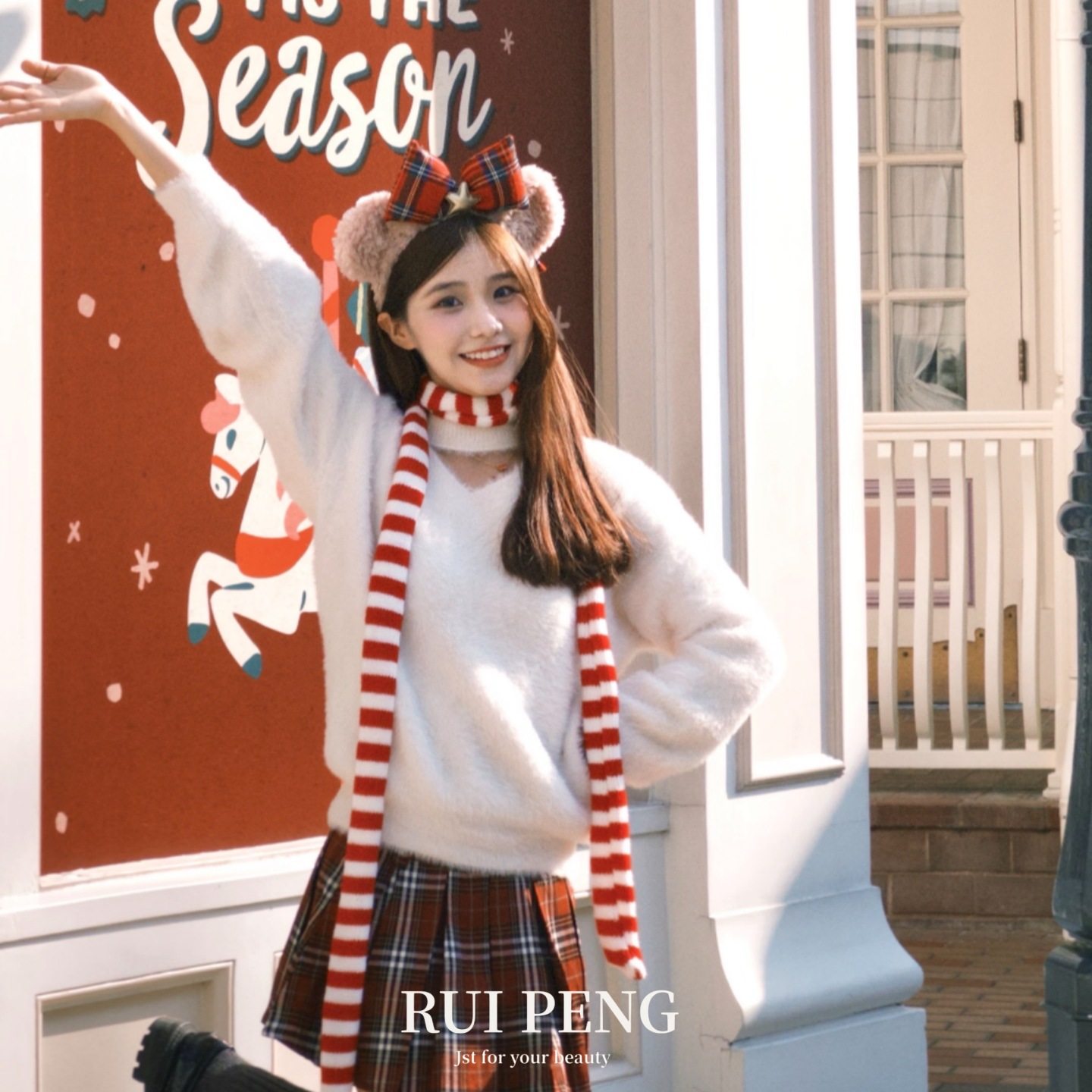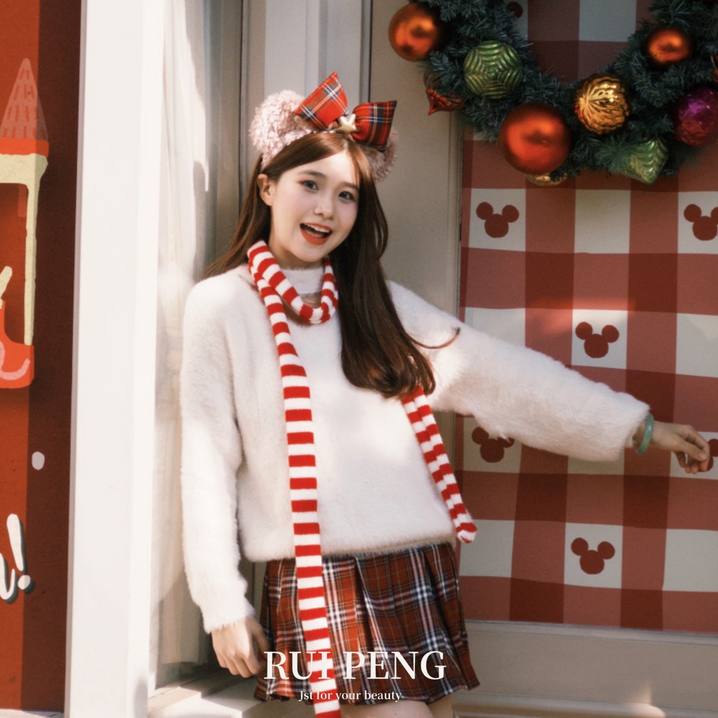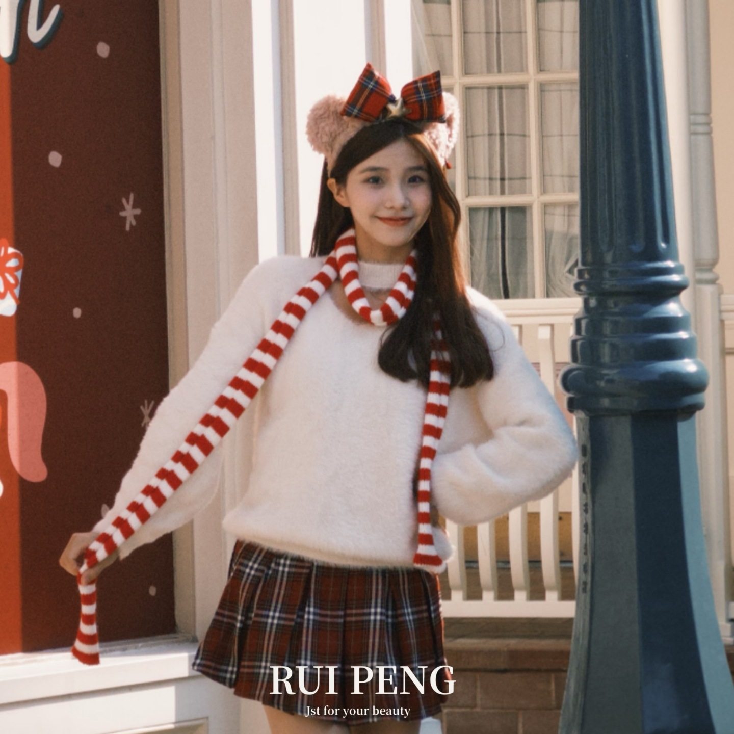 韩系圣诞红白色条纹细长腊肠围巾冬针织毛线围脖2025新款 系脖颈饰