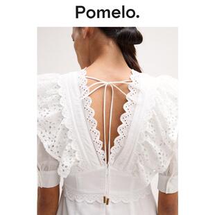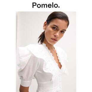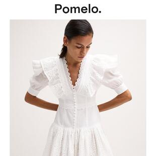 连衣裙 V领荷叶边收腰小众设计感短款 Pomelo 白色蕾丝连衣裙女法式