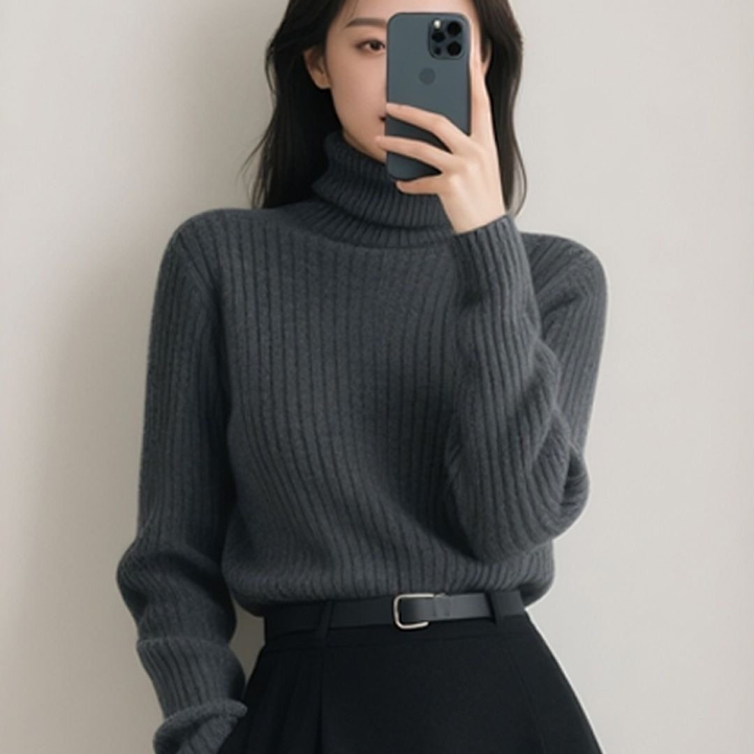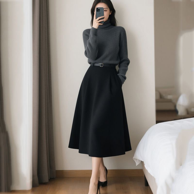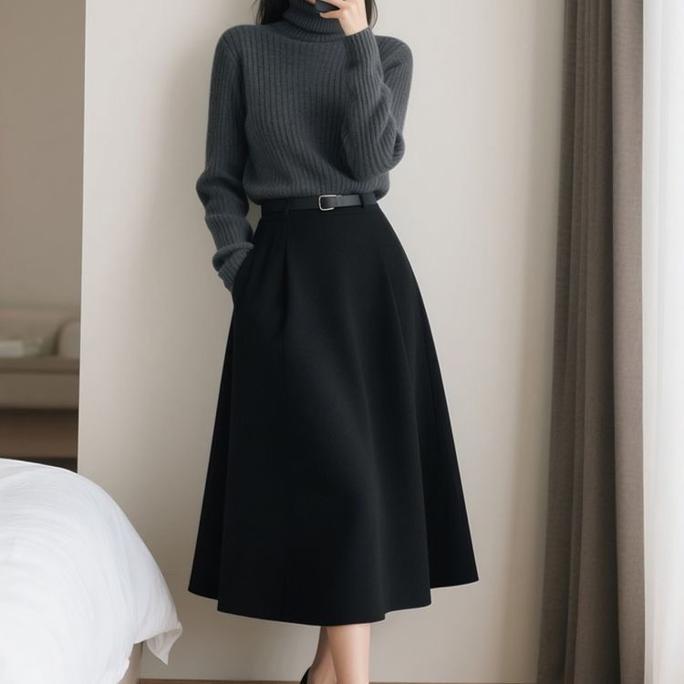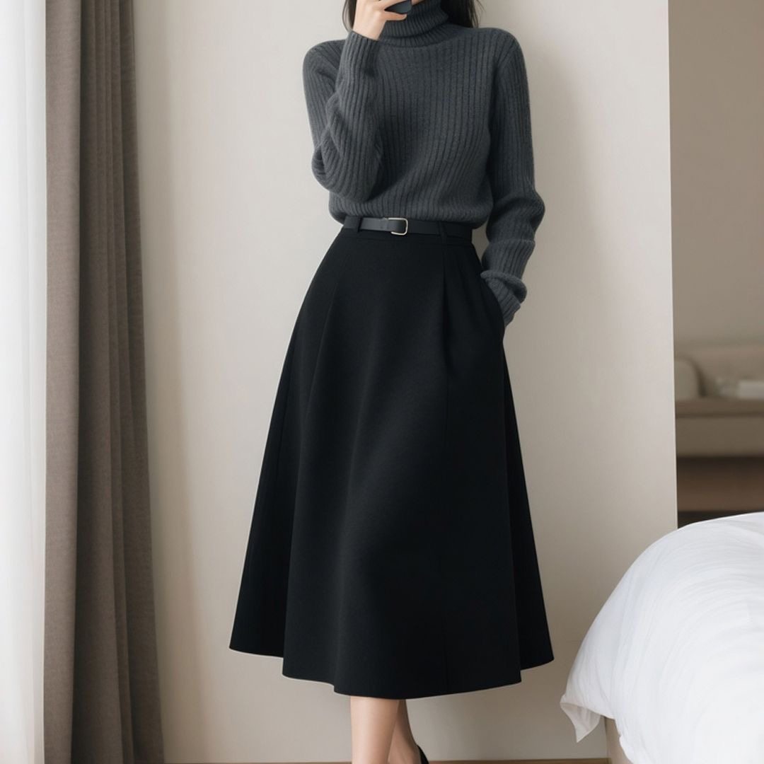 冬季 女秋冬显瘦套裙 高领毛衣针织打底上衣口袋毛呢半身裙两件套装