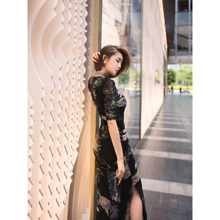 纯色形体表演出旗袍裙 走秀旗袍2022春夏新款 加长中袖 蕾丝丝绒长款
