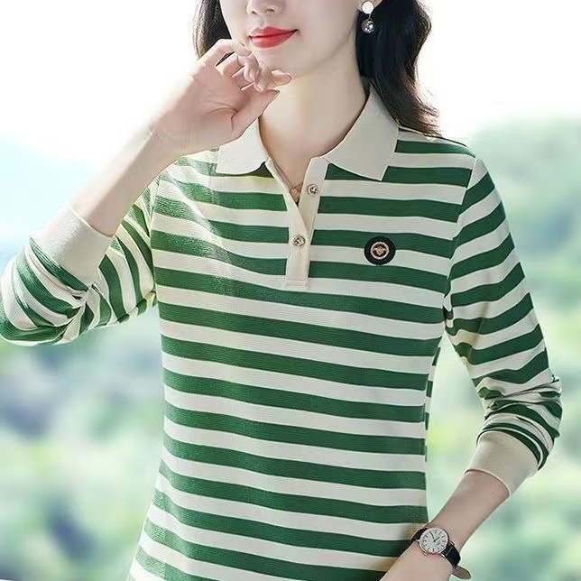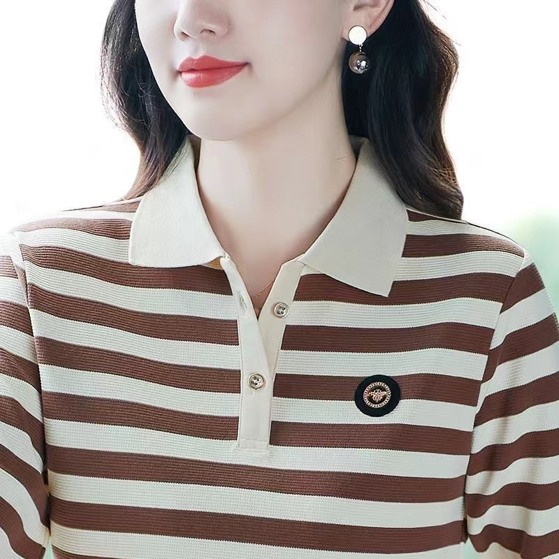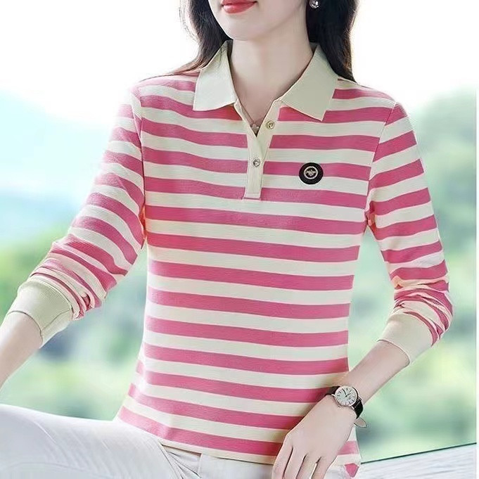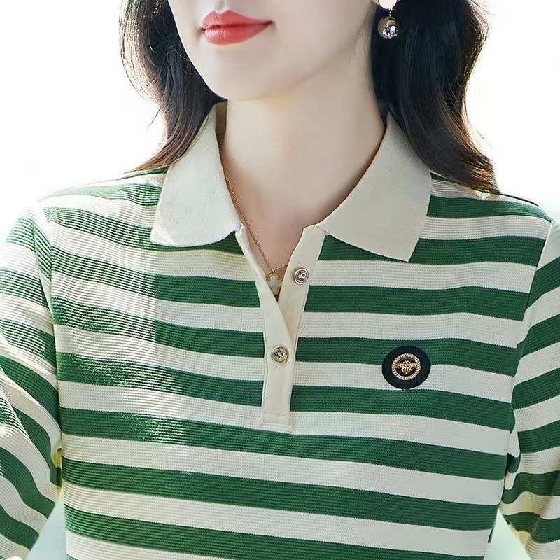 新款 大码 条纹长袖 翻领上衣打底Polo衫 潮 t恤女中年妈妈装 2024春季
