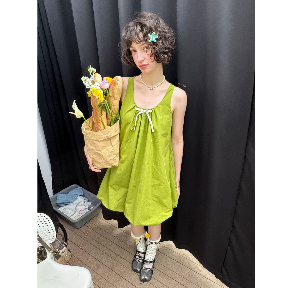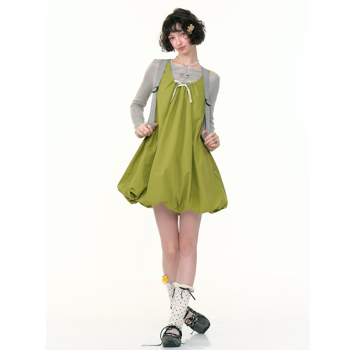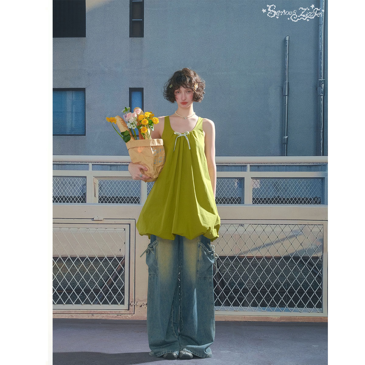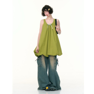 复古设计感蝴蝶结绿色花苞无袖 美式 兜兜连衣裙女 新款 ziziFei夏季
