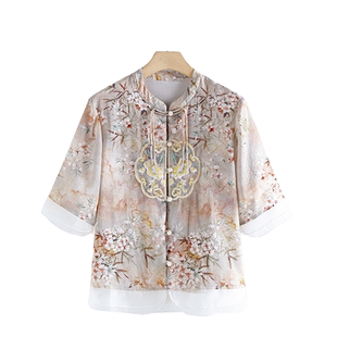 中老年套装 妈妈装 立领高贵中年气质复古上衣中袖 中国风衬衫 女 夏装