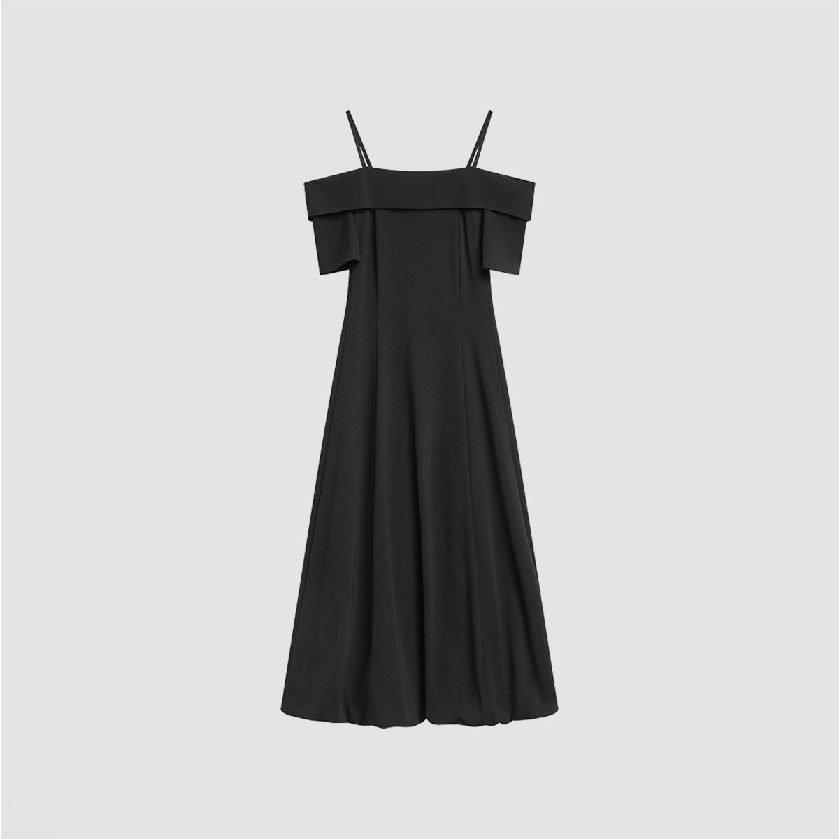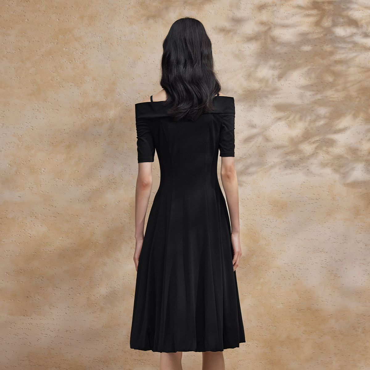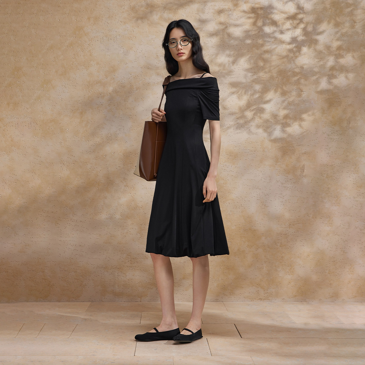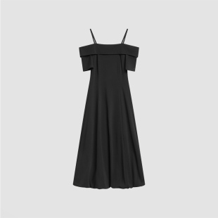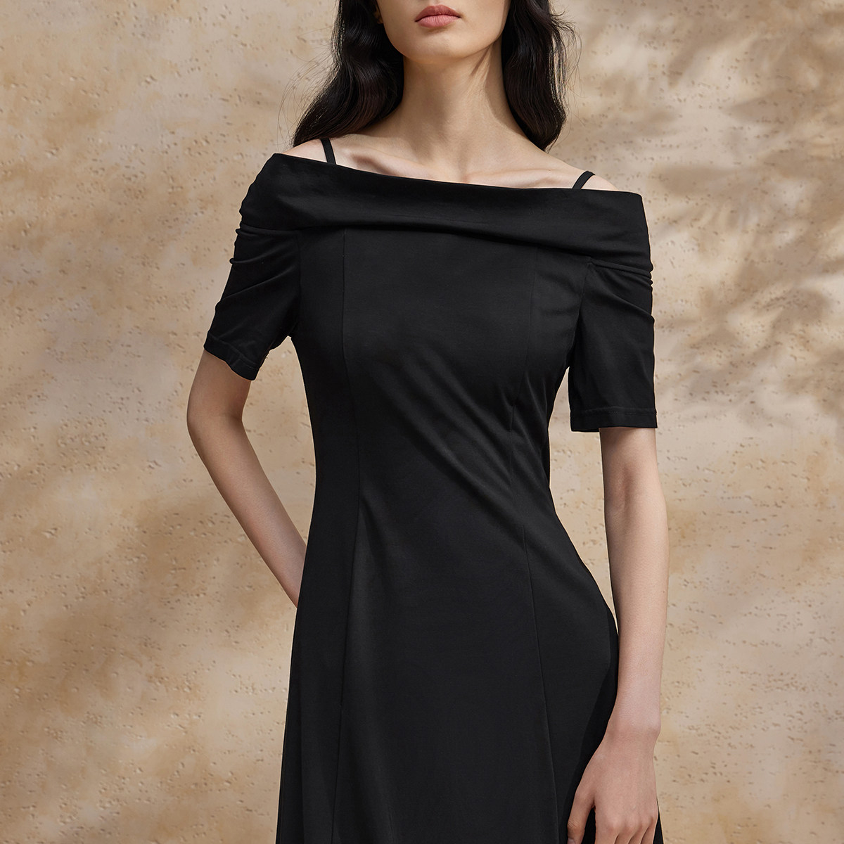 播一字肩优雅连衣裙女商场同款 气质小黑裙BDR2LD1135 收腰显瘦法式