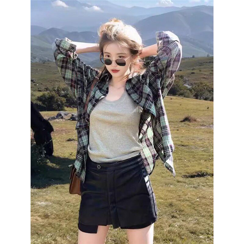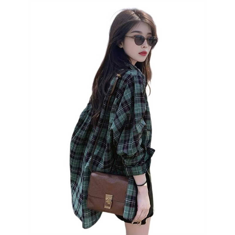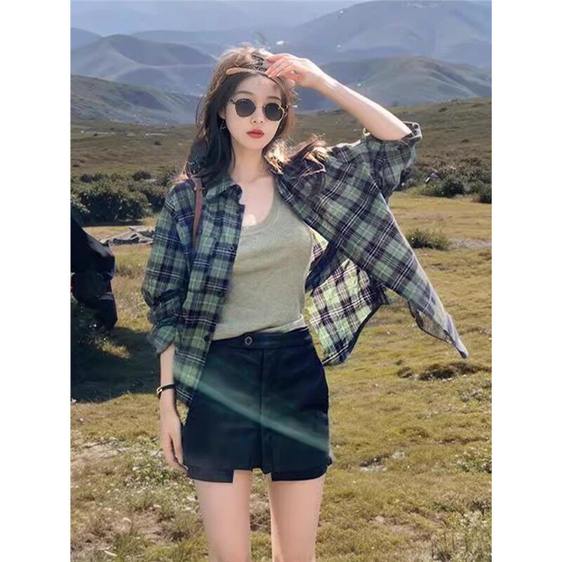 宽松衬衣外套长袖 绿色格子防晒衬衫 小个子外搭开衫 薄款 上衣 女夏季