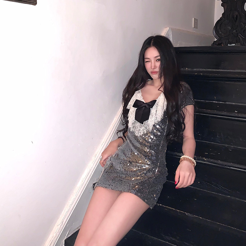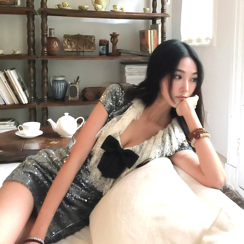 V领显瘦复古气质裙子 新款 Boamarket bling蕾丝连衣裙女2025夏季