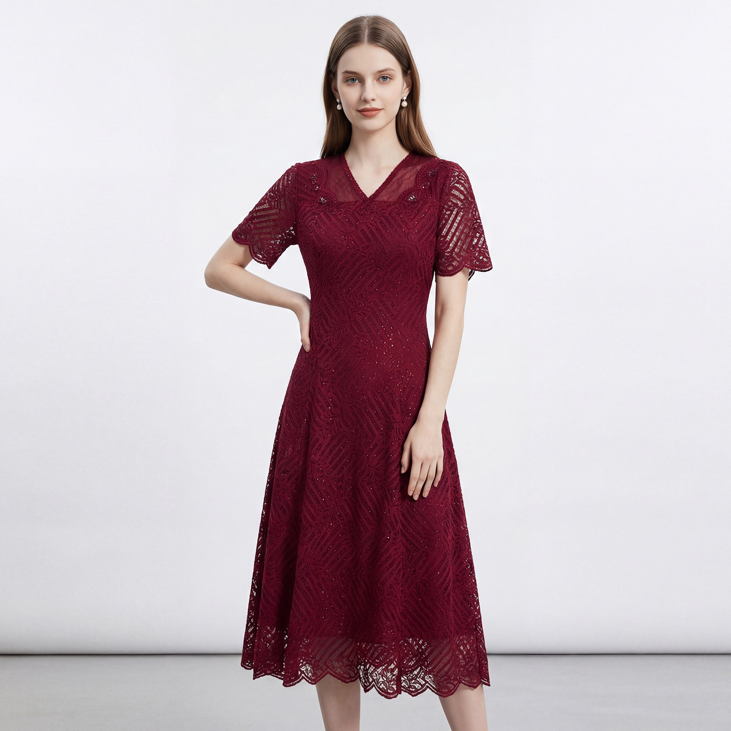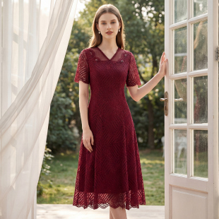 收腰婚宴礼服 红色V领绣花气质连衣裙钉珠长裙短袖 马天奴夏季 新款