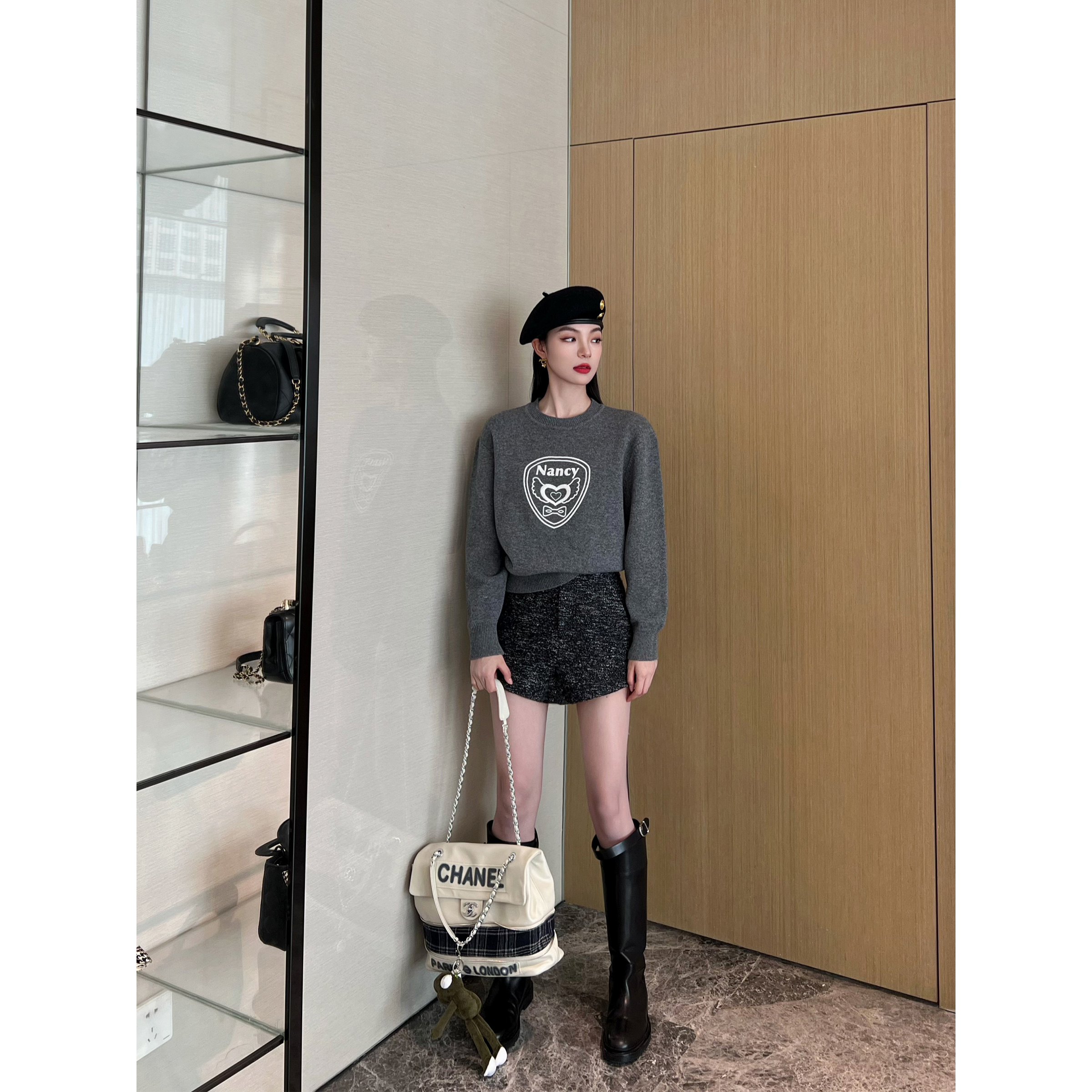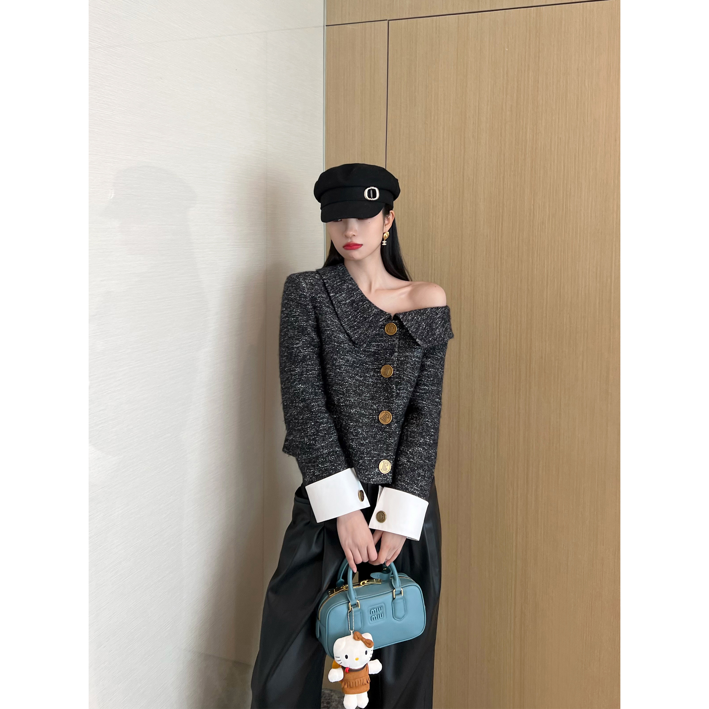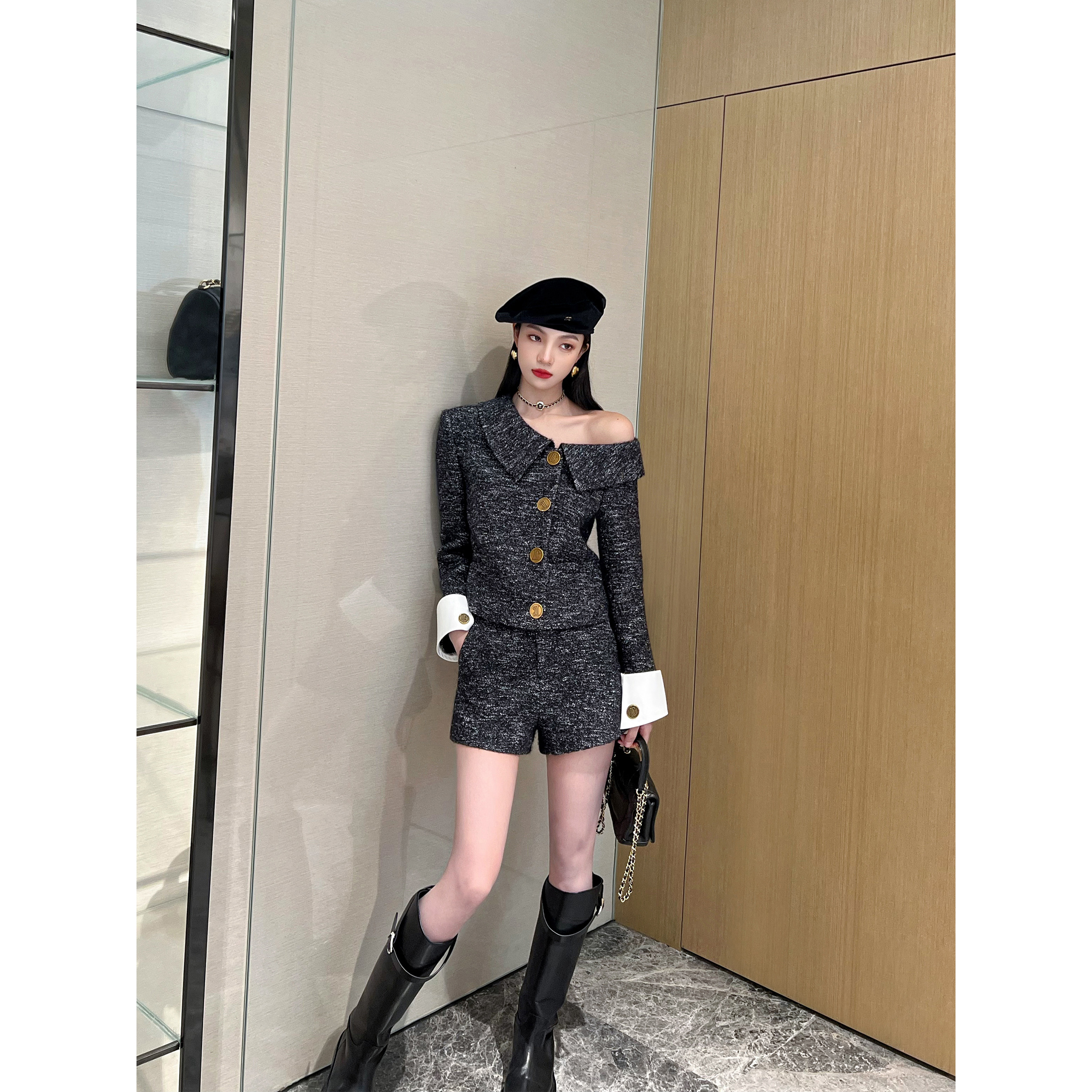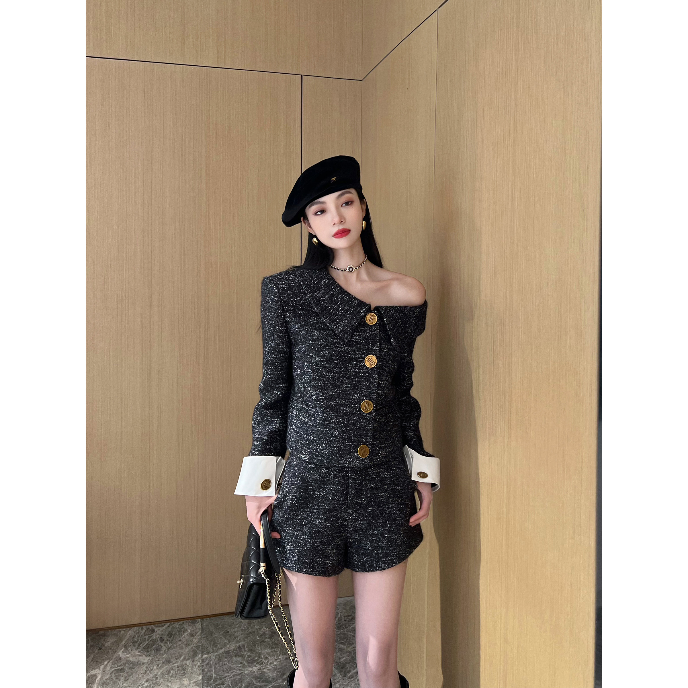 微A短裤 不规则斜肩小翻领上衣 马海毛混纺 NancyCavally高端羊毛