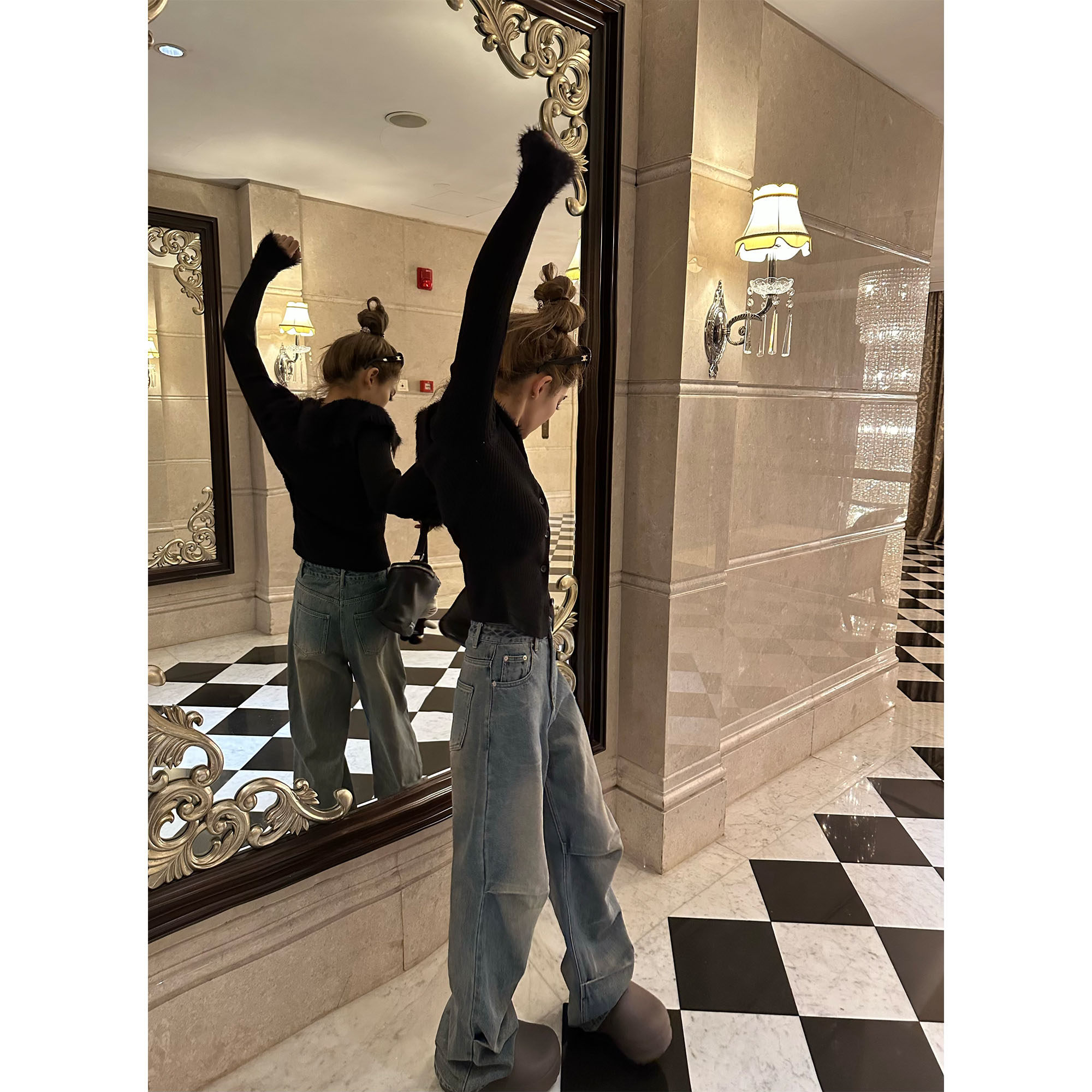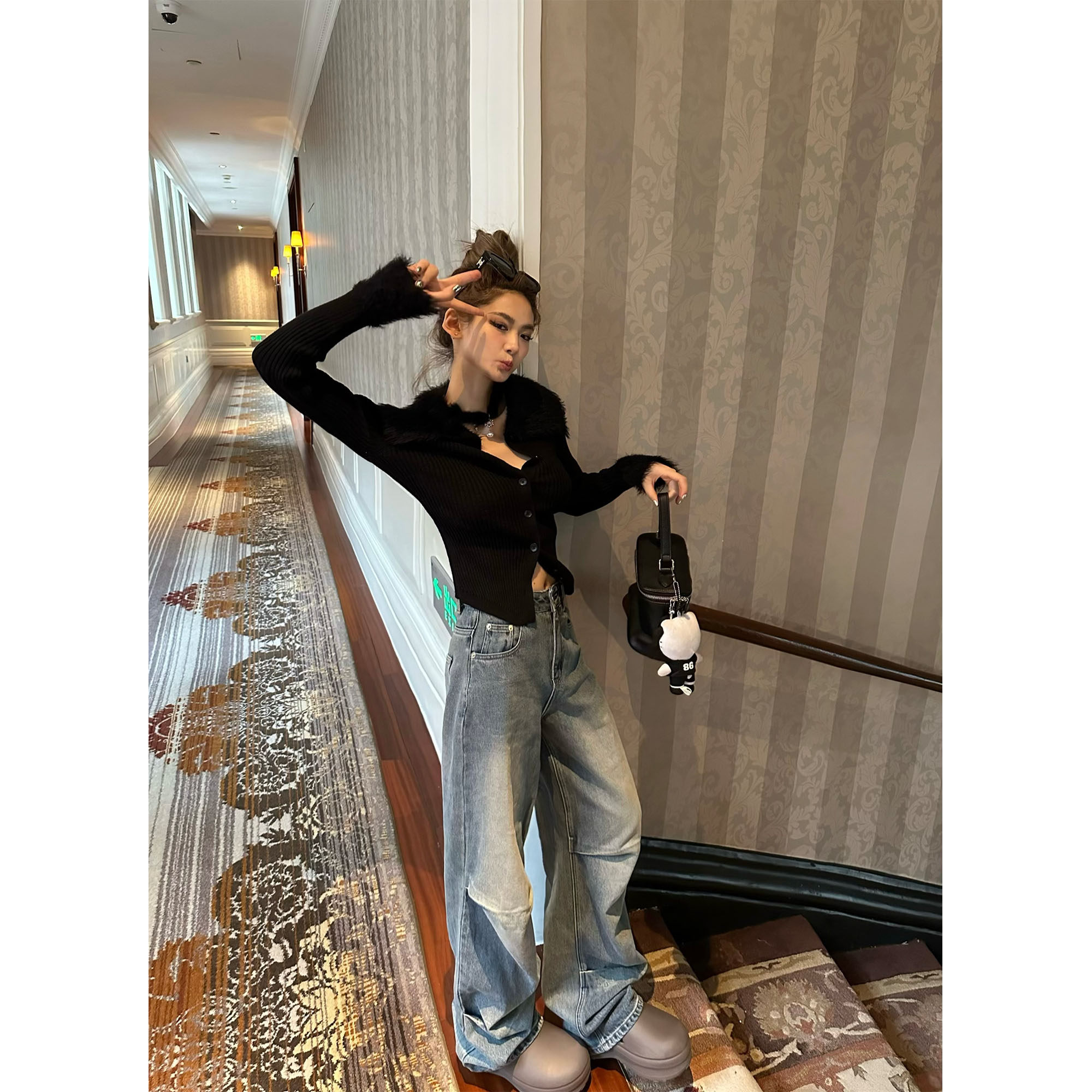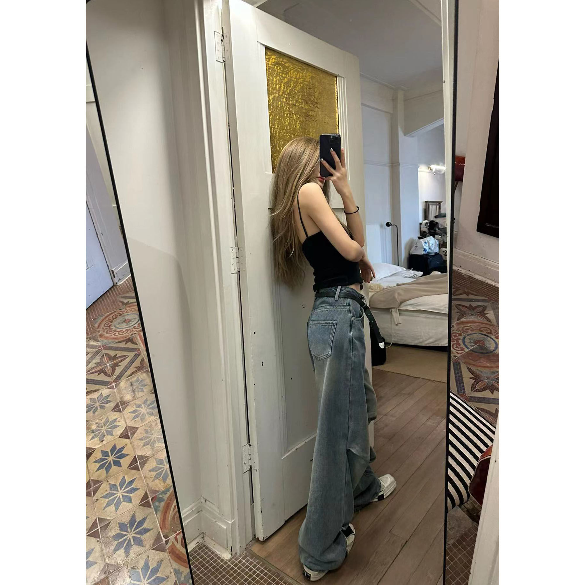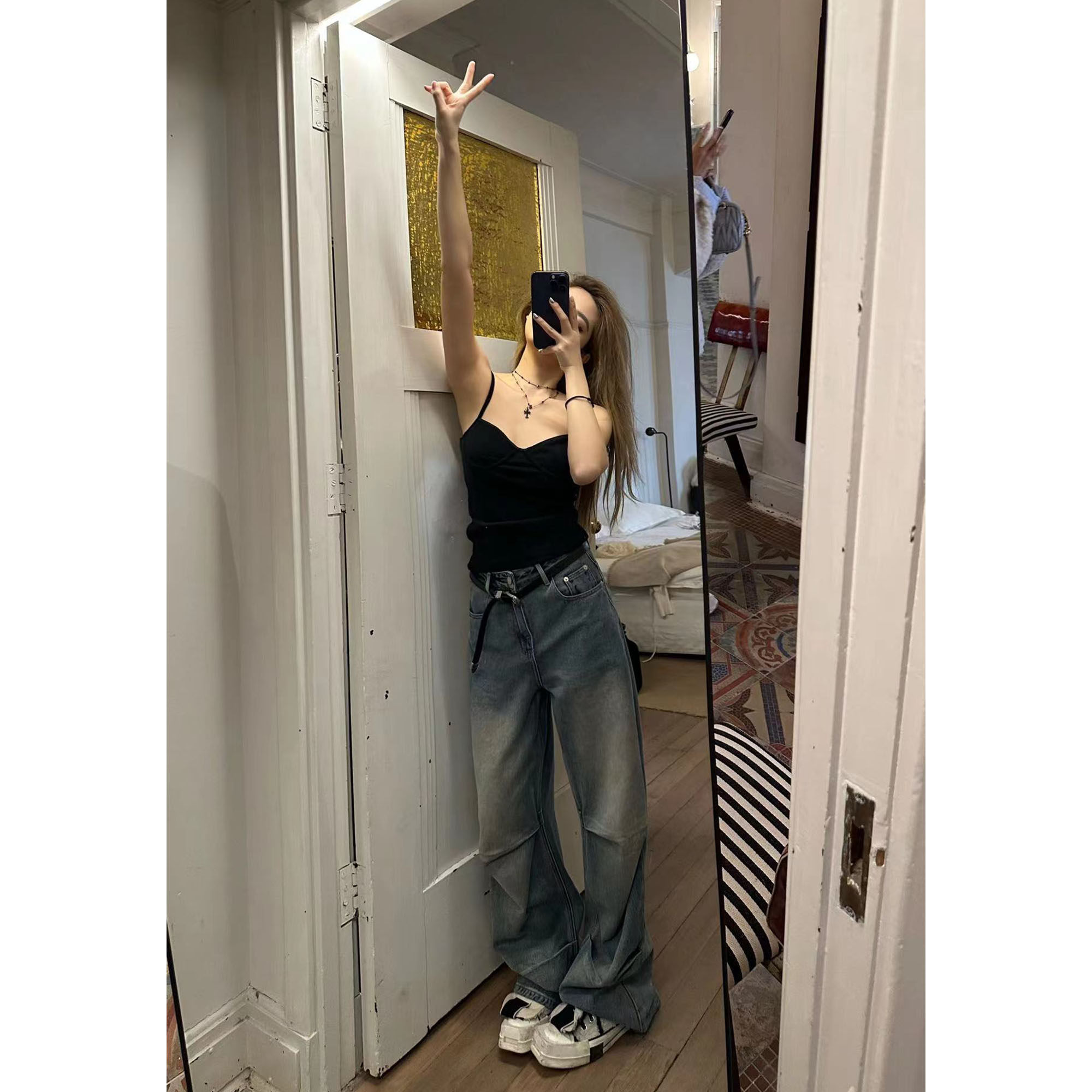 长裤 Xinlei 水洗中高腰休闲牛仔裤 嬉皮褶褶直筒裤 女春夏 Lin