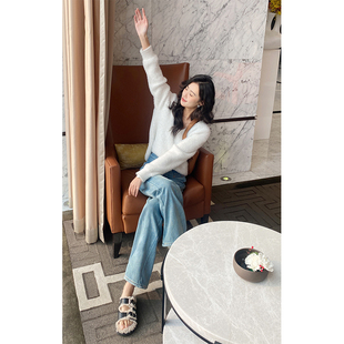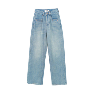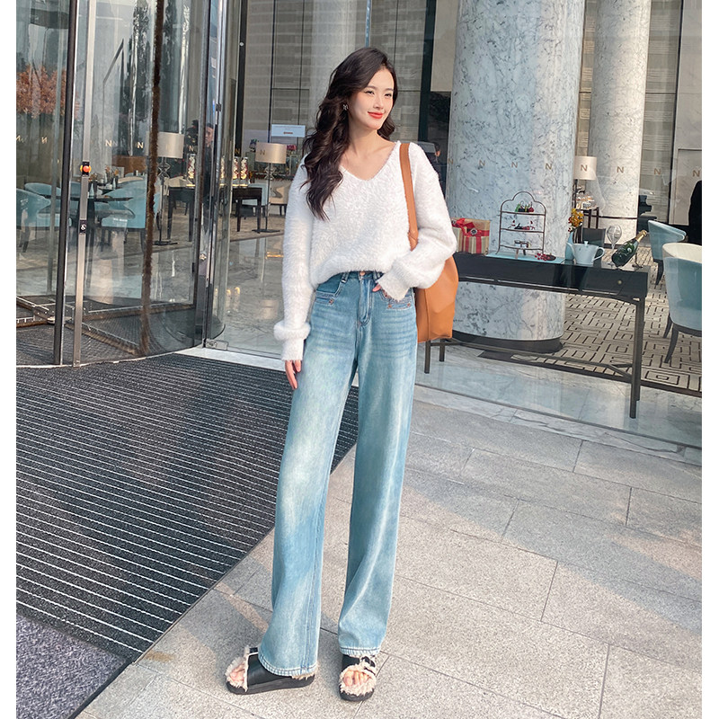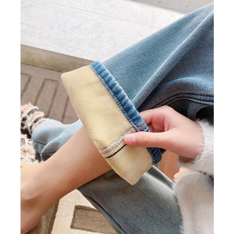 浅蓝色宽松垂感直筒长裤 女冬季 子 阔腿牛仔裤 加绒加厚保暖高腰窄版