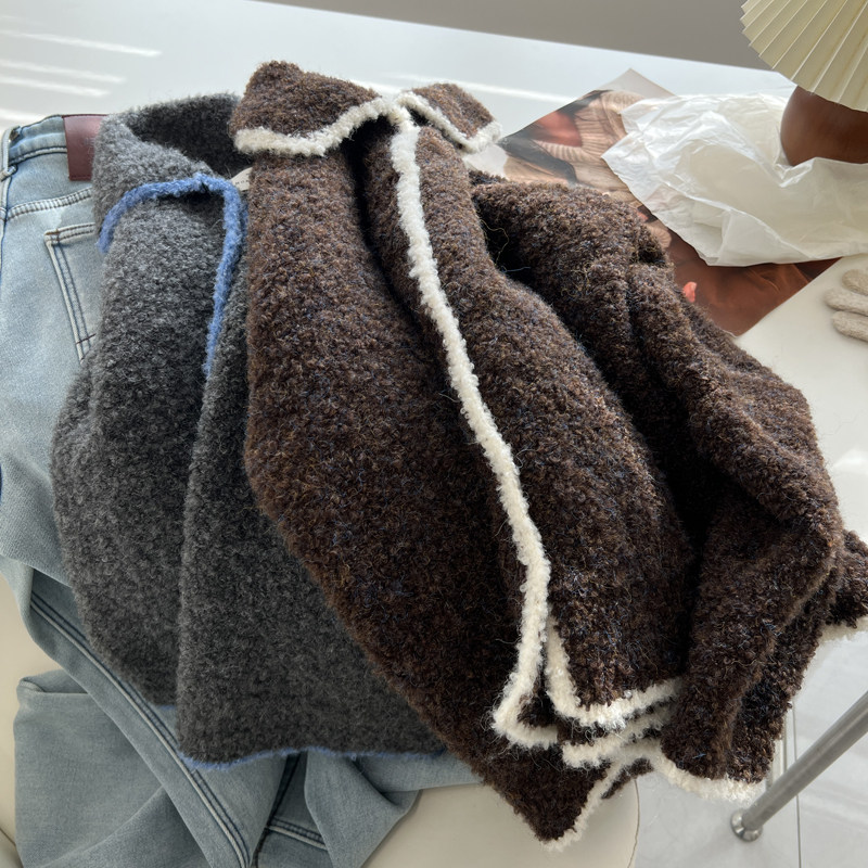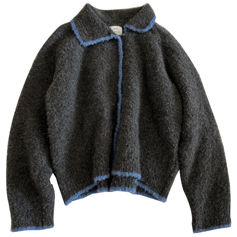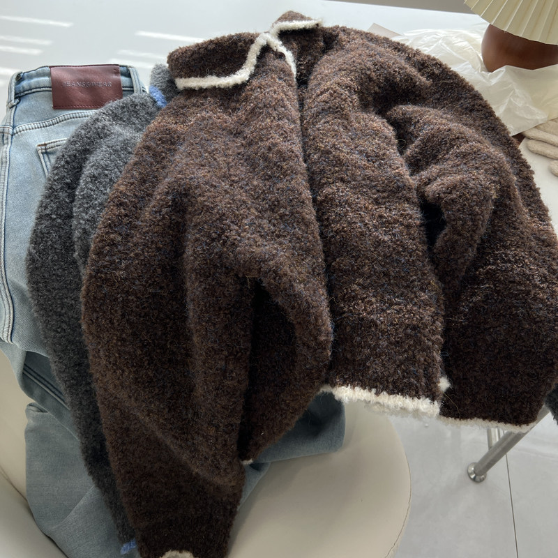 外套秋冬新款 毛衣女宽松慵懒可爱减龄针织衫 复古镶边翻领开衫 韩版
