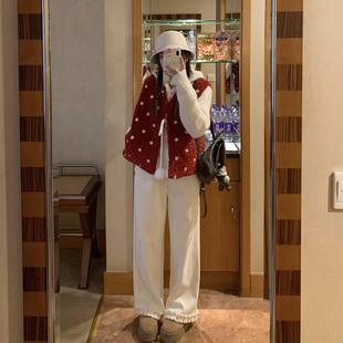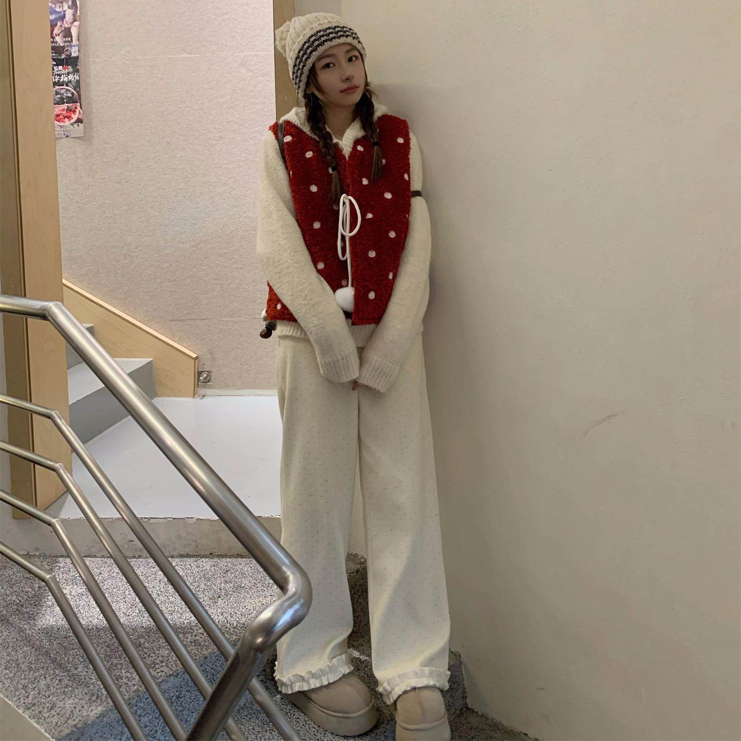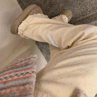 TheDouerr 芝士奶酪米白波点加绒花边松紧灯芯绒裤