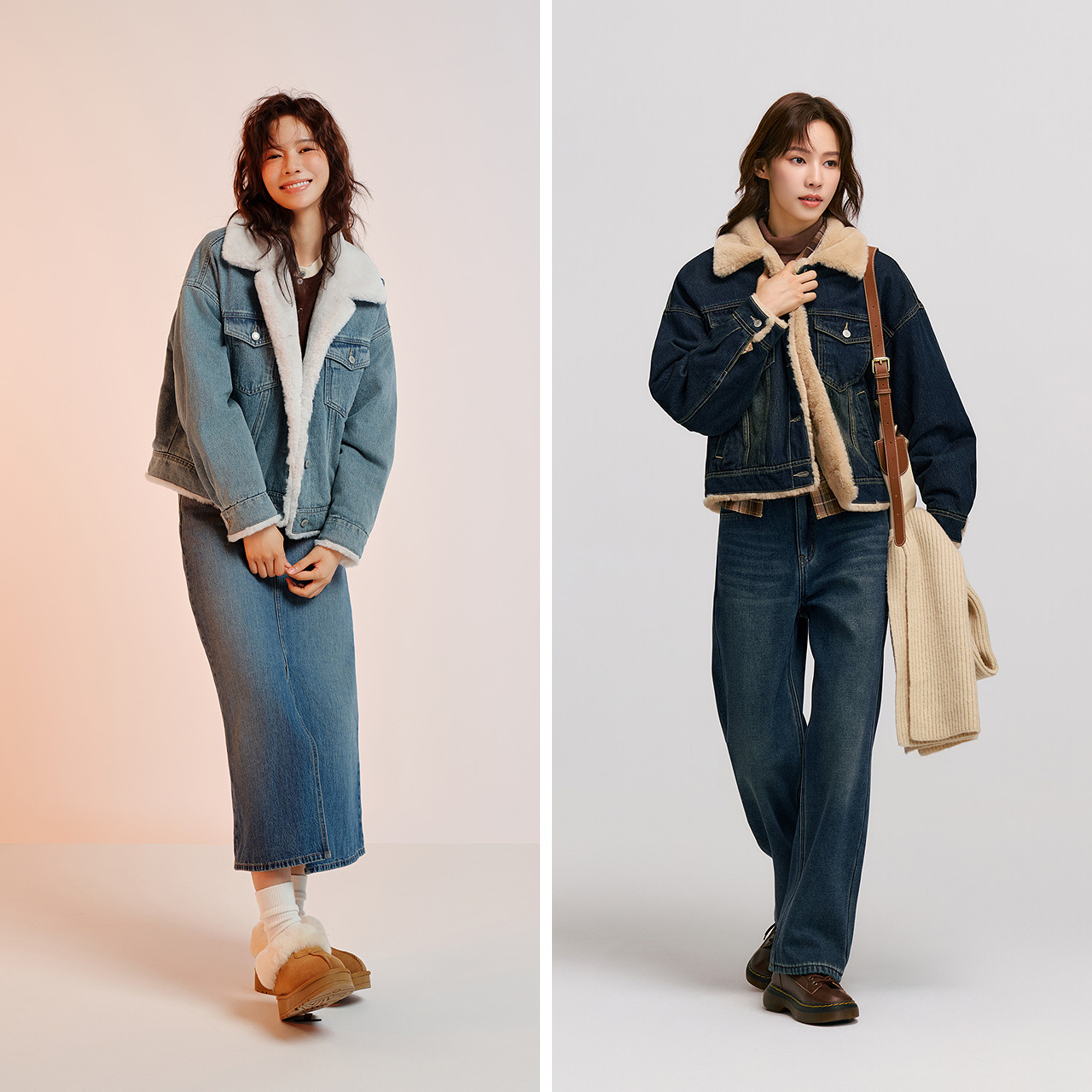 森马牛仔外套女拼接仿兔毛翻领宽松潮流港风冬季 落肩夹棉夹克复古
