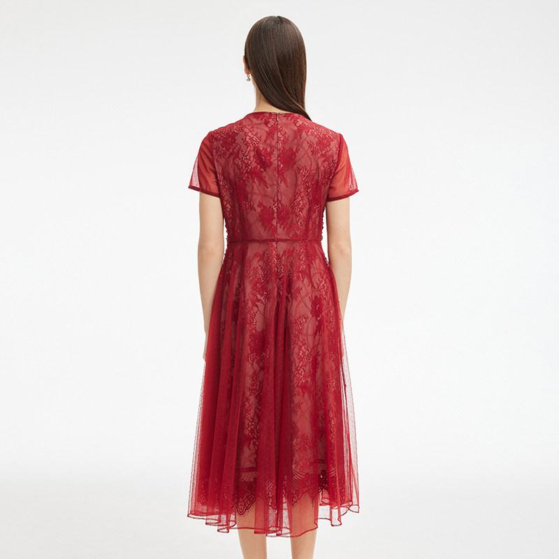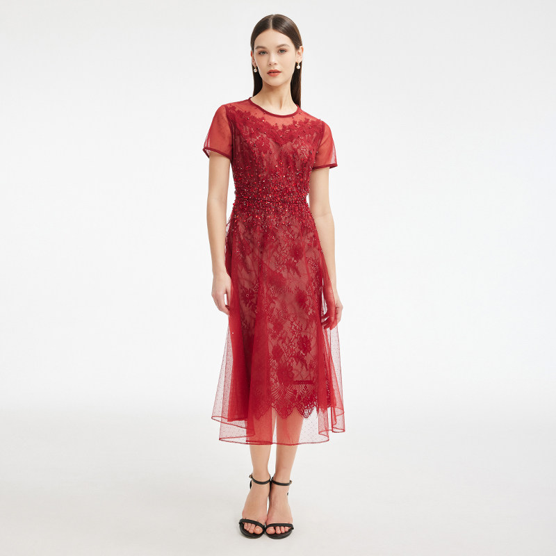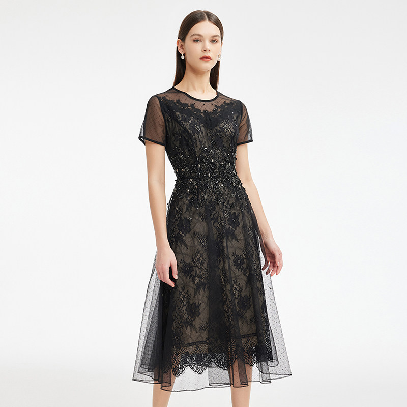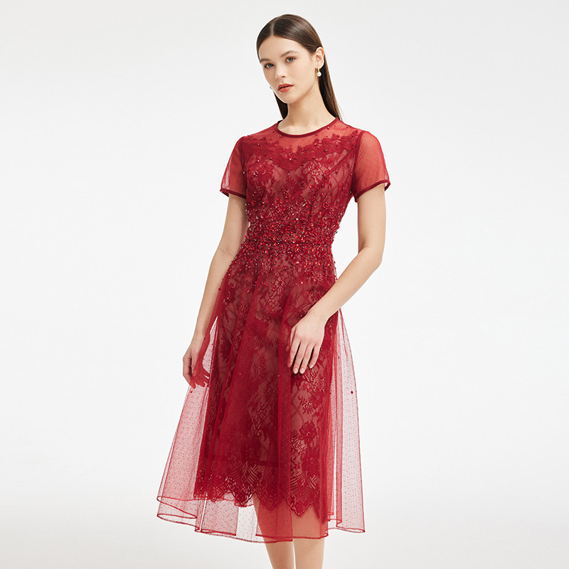 夏季 婚宴礼裙时尚 马天奴女钉珠蕾丝刺绣连衣裙子短袖 专柜正品
