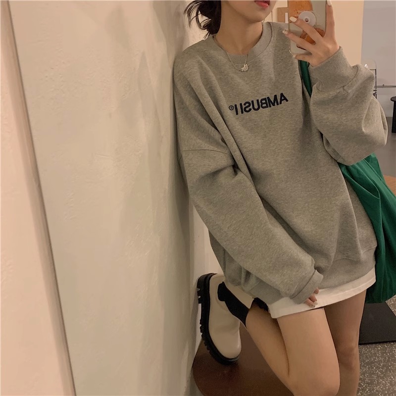 重磅纯棉美式 灰色圆领卫衣女秋冬加绒加厚慵懒风宽松气质无帽上衣