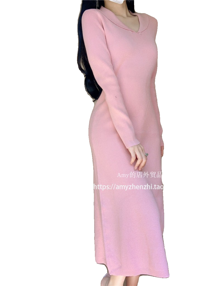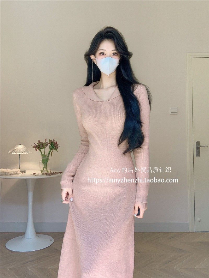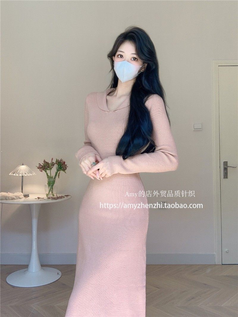 显瘦针织长裙子 连衣裙修身 Suny雅乔 秋冬粉色少女感烫钻露肩长袖