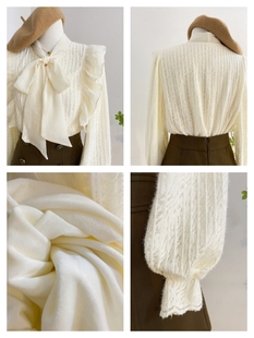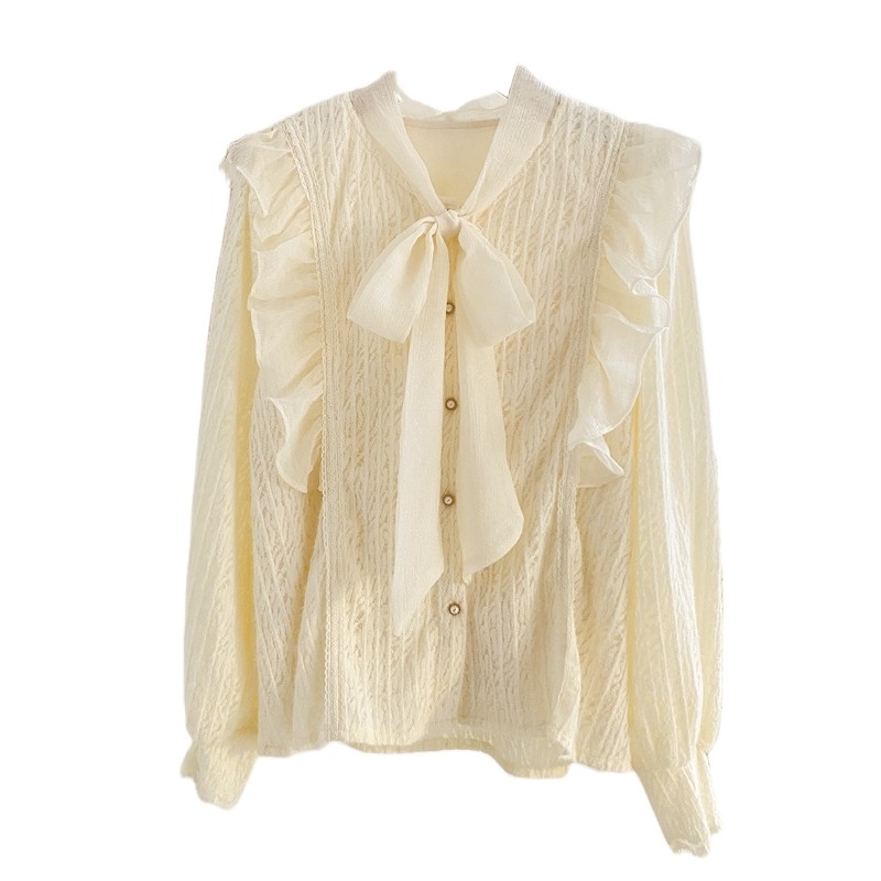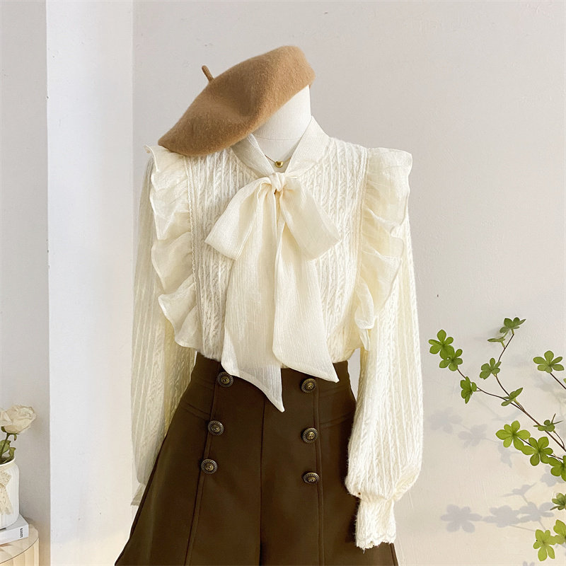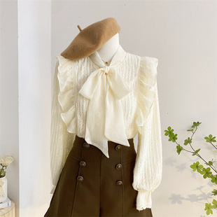 女秋冬气质内搭打底小衫 衬衫 上衣杏 加绒加厚长袖 系带蝴蝶结蕾丝衫