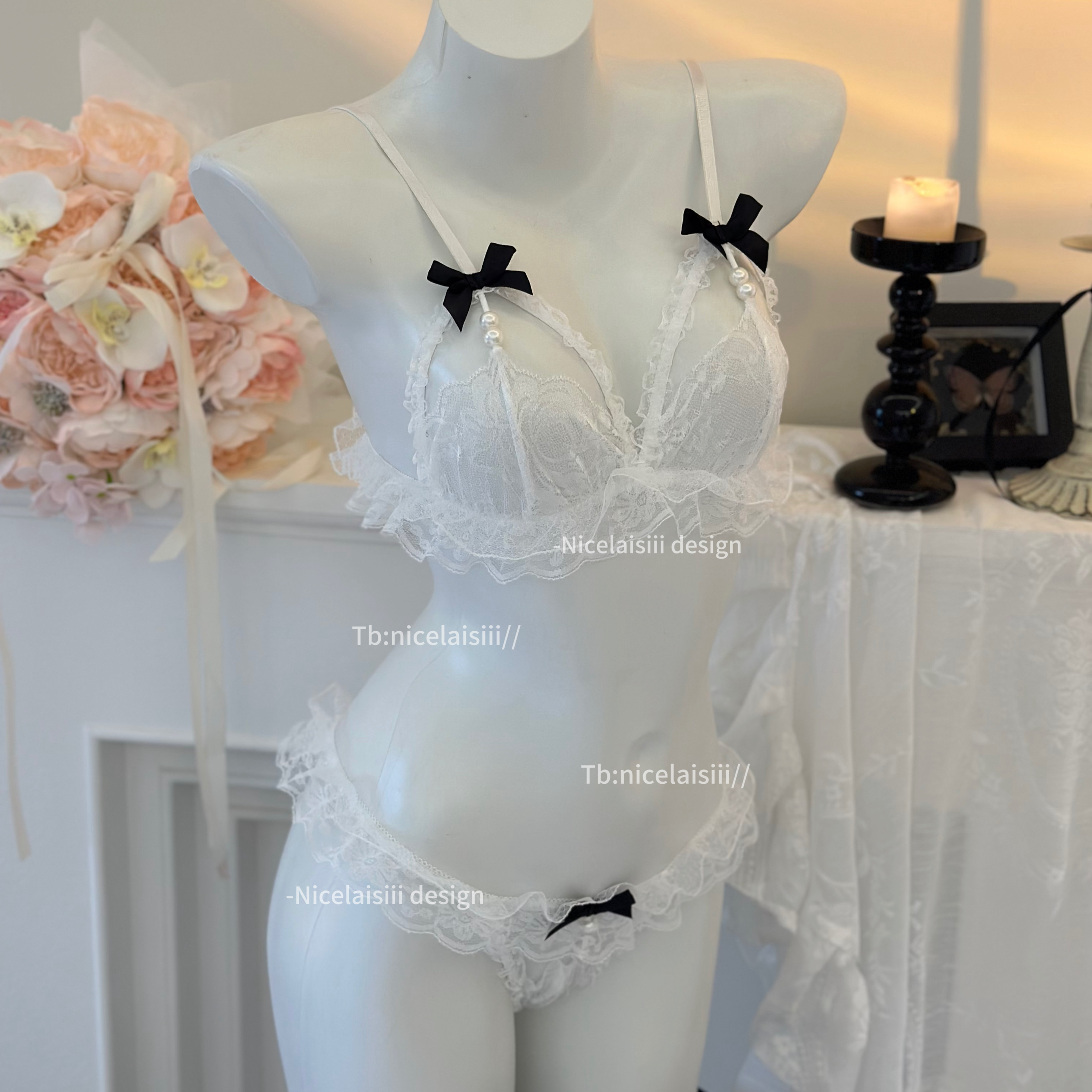 文胸套装 六只兔子小怪瘦法式 三角杯内衣女性感蕾丝大胸显小薄款