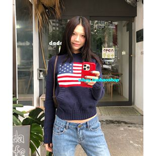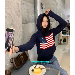eihey诶嘿美式 套头连帽针织毛衣女 复古洋气旗帜图案宽松圆领修身