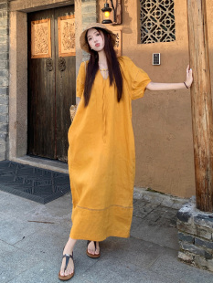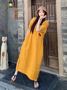 亚麻连衣裙减龄显瘦休闲裙 胖mm多巴胺宽松遮肉V领灯笼袖 大码 女装