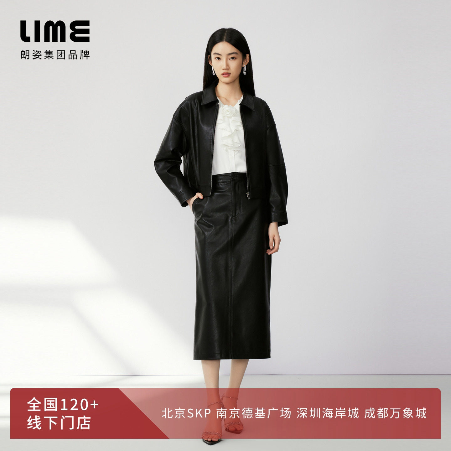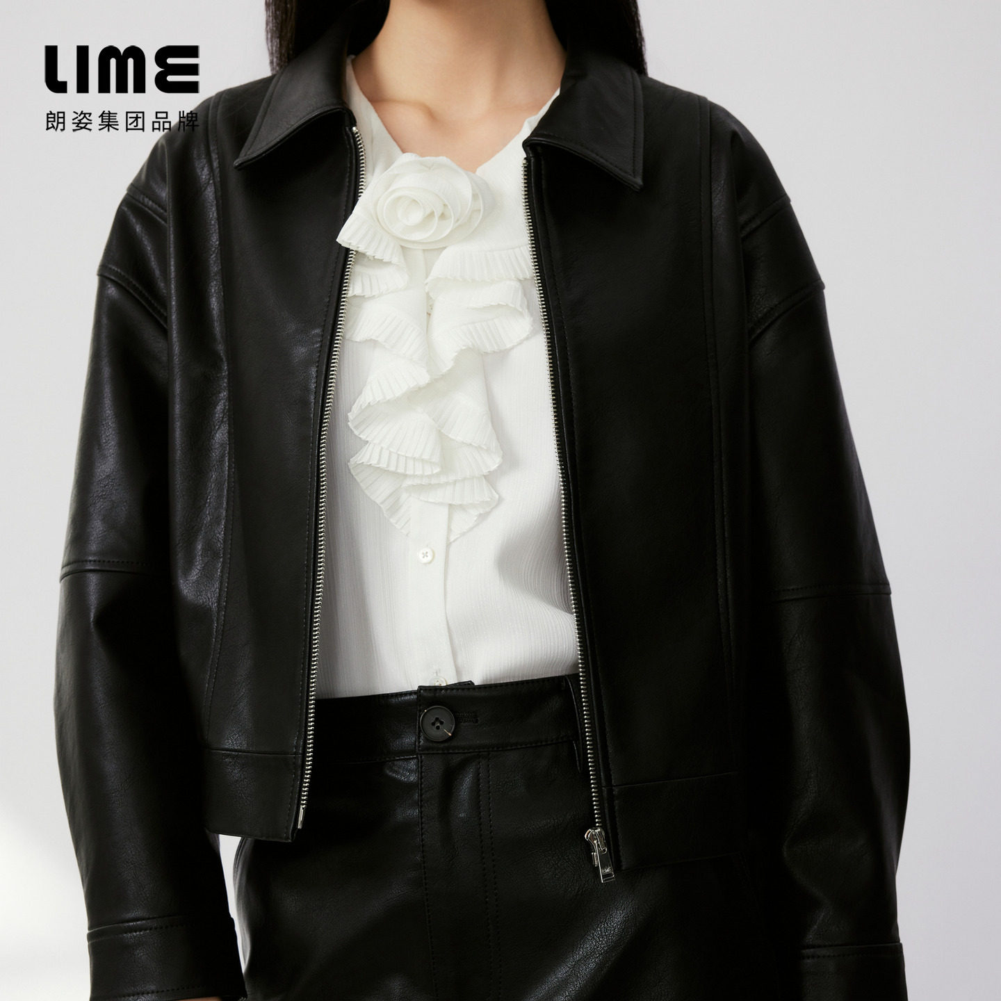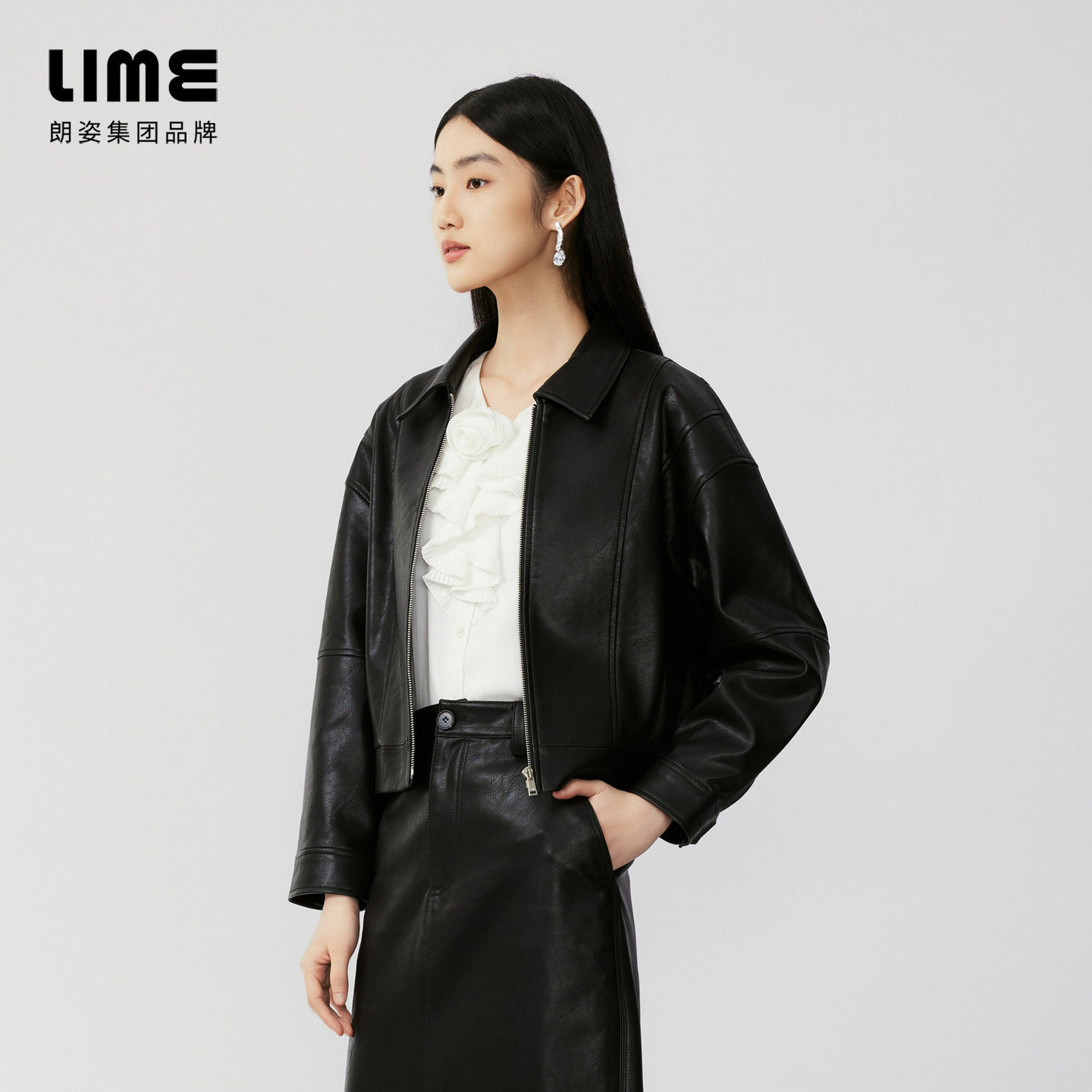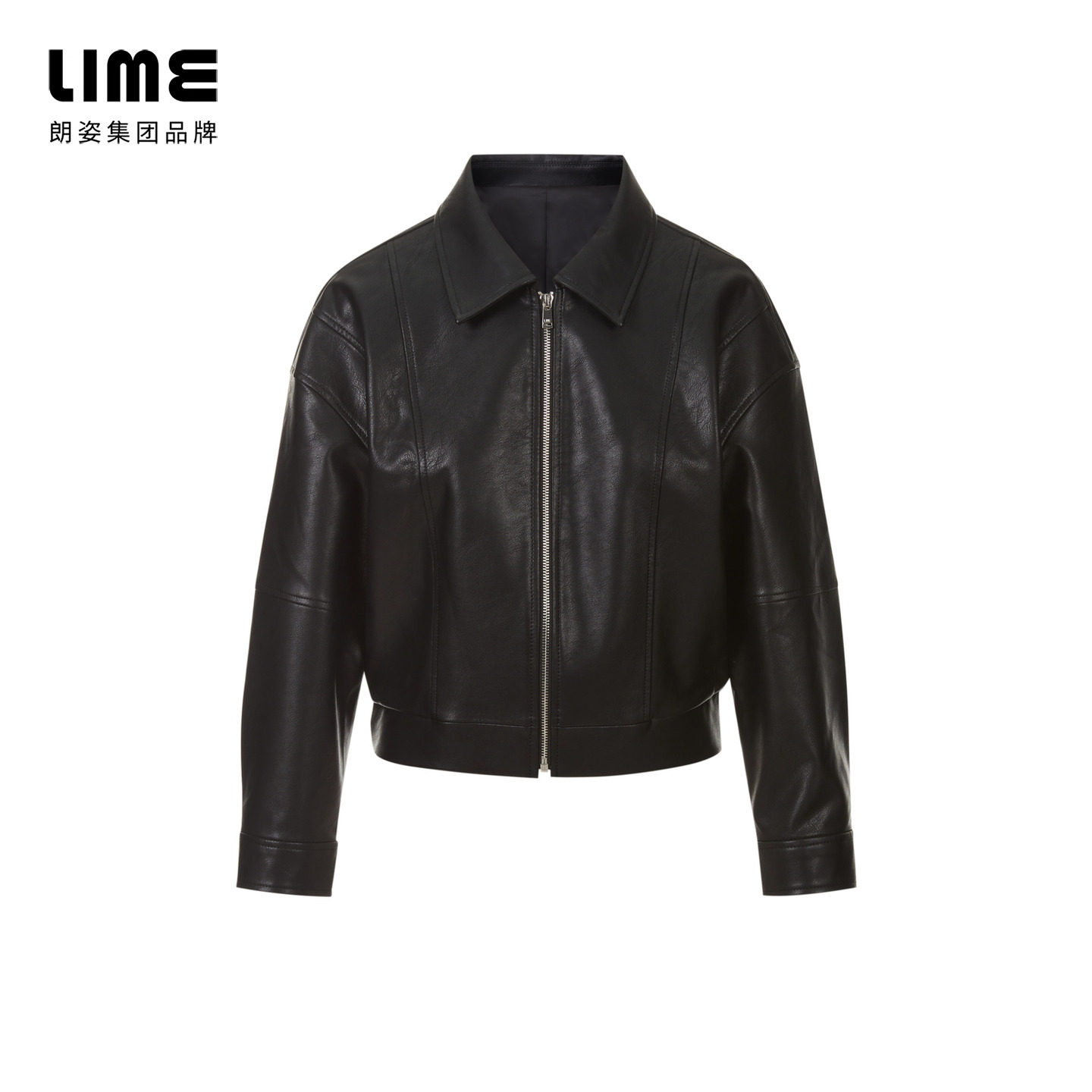型灯笼袖 PU涂层H版 设计感外套 翻领黑夹克2024秋新款 LIME莱茵法式