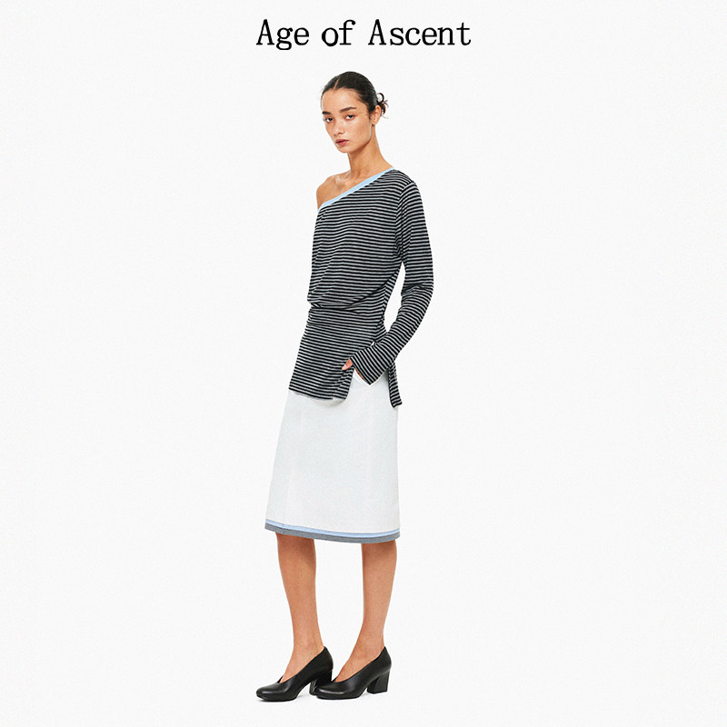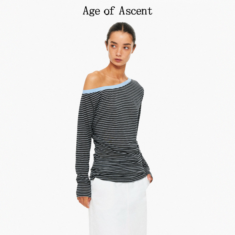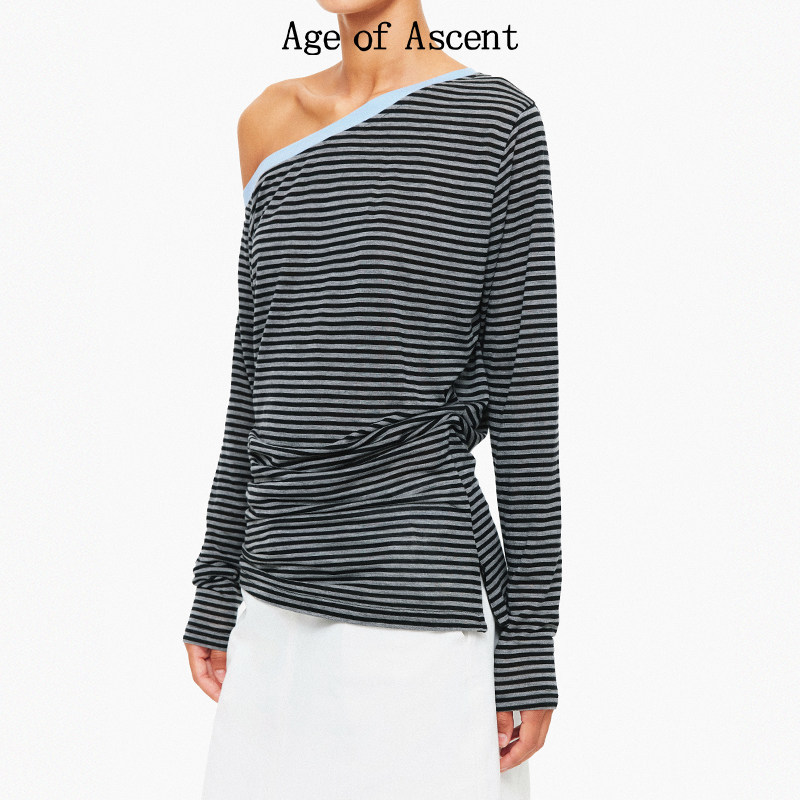 天丝莱赛尔不对称斜肩撞色多穿法条纹堆叠针织T恤 Ascent Age