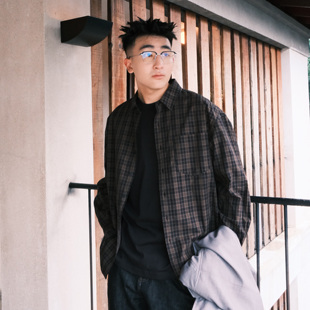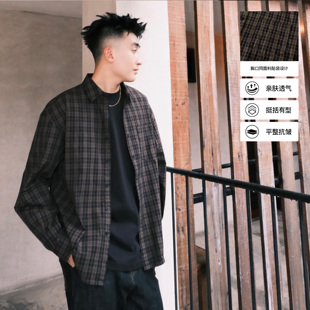 棕色格子长袖 格物致知 衬衫 男士 宽松百搭衬衣 SANBAI 秋季 叁佰