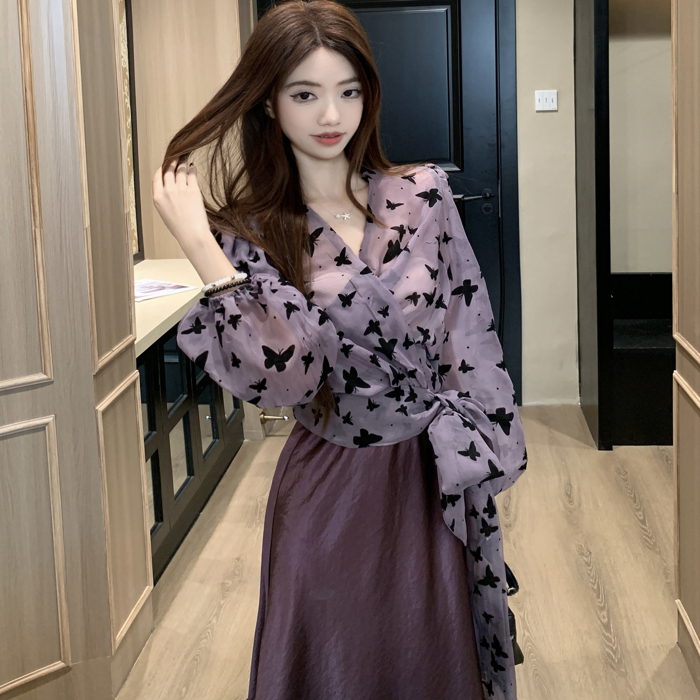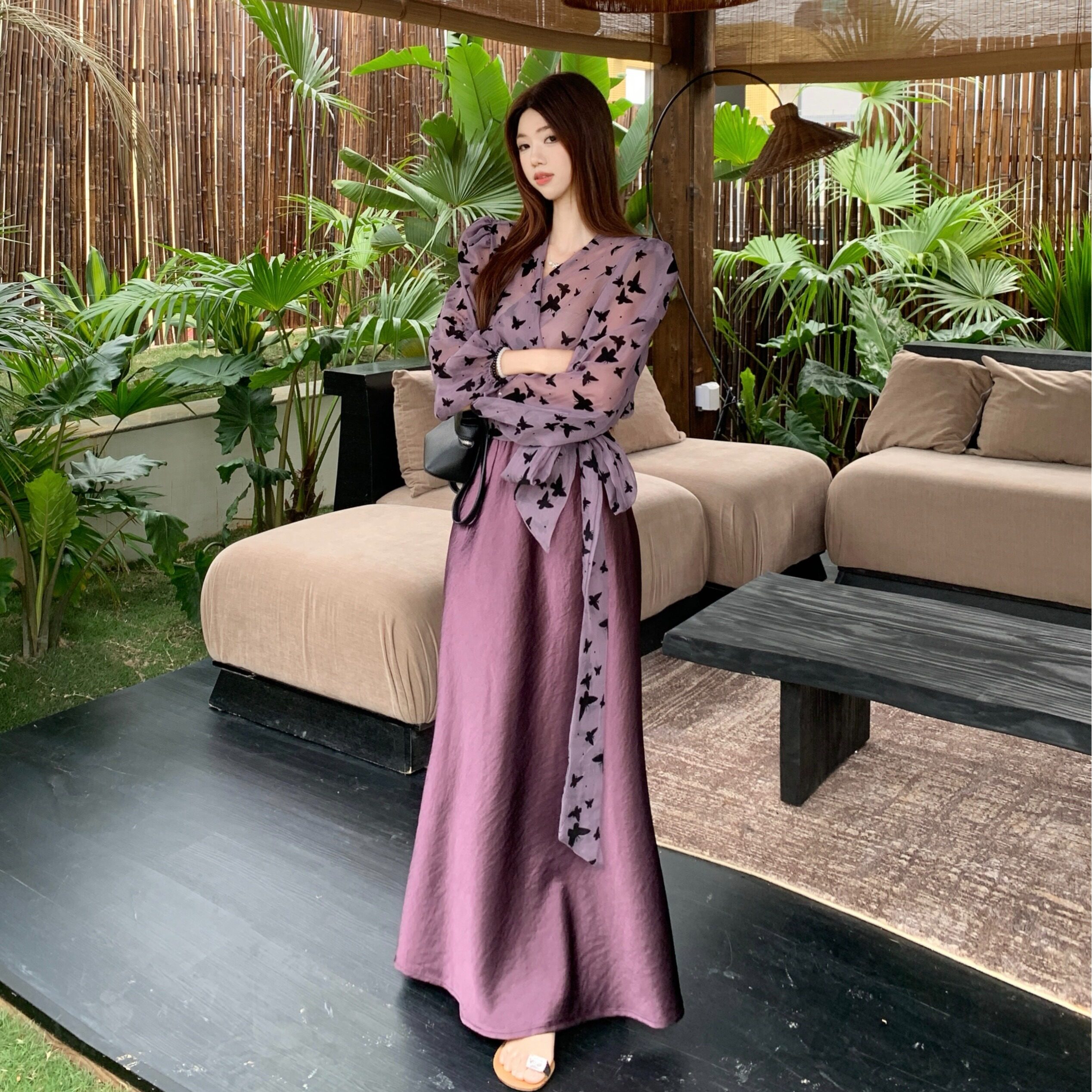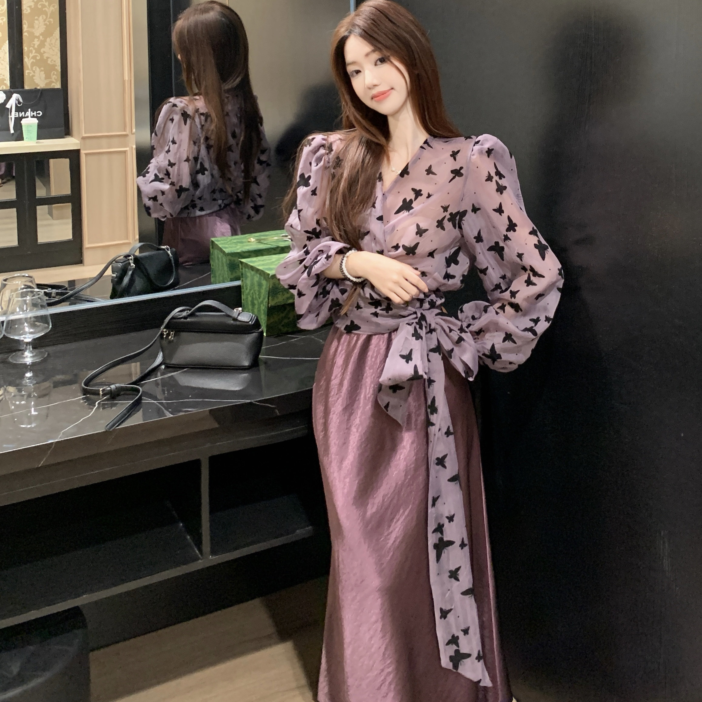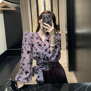春季 法式 衬衫 裙女蝴蝶绑带长袖 半身裙包臀裙紫色两件套女 气质套装