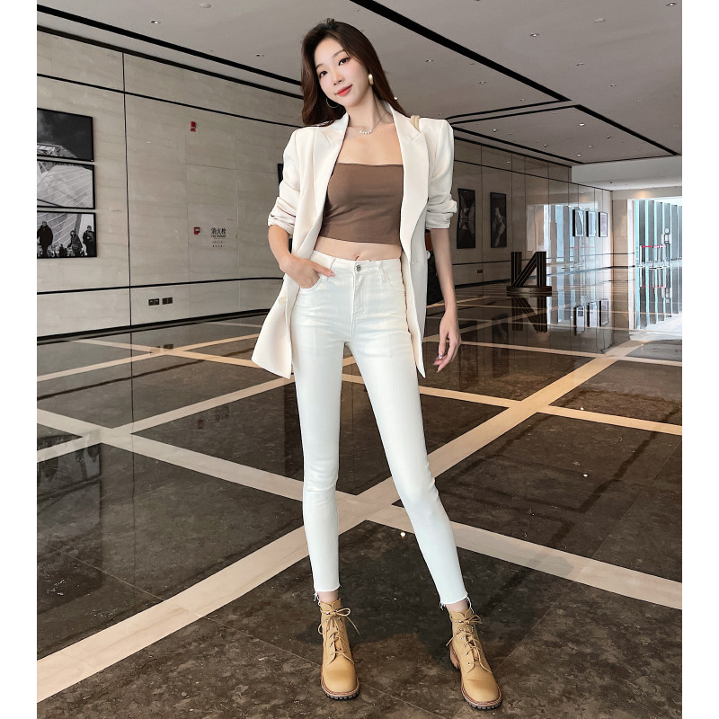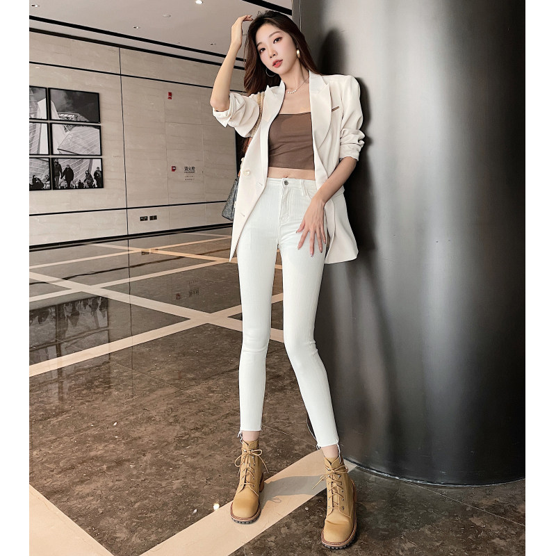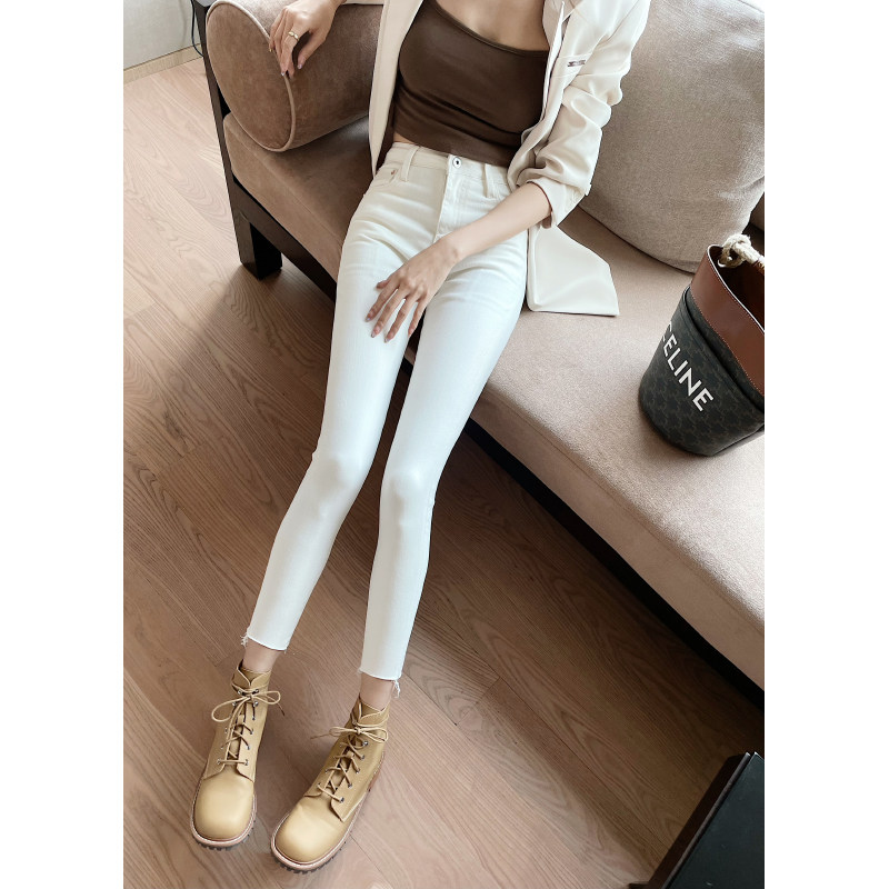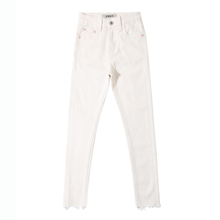 高腰收腹显瘦毛边九分裤 女春秋新款 潮 MIER米白色小脚铅笔牛仔裤