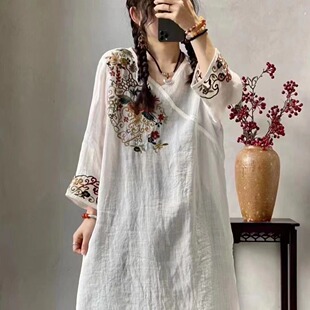 文艺复古上衣九分袖 新款 裙子 夏季 重工刺绣民族风棉麻连衣裙中长款