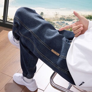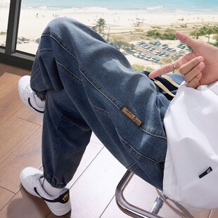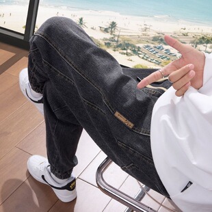 灰色水洗做旧拼接牛仔裤 潮流男士 松紧腰小脚裤 网红爆款 束脚哈伦裤