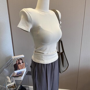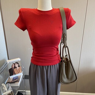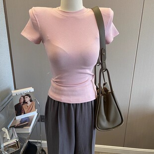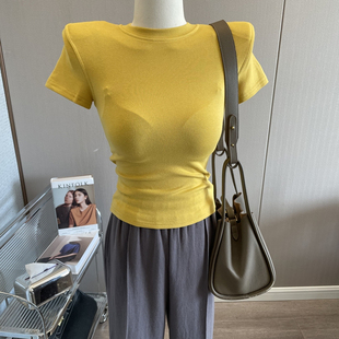 T恤女圆领弹力打底衫 自留 短袖 垫肩上衣辣妹修身 显瘦内搭夏 基础款