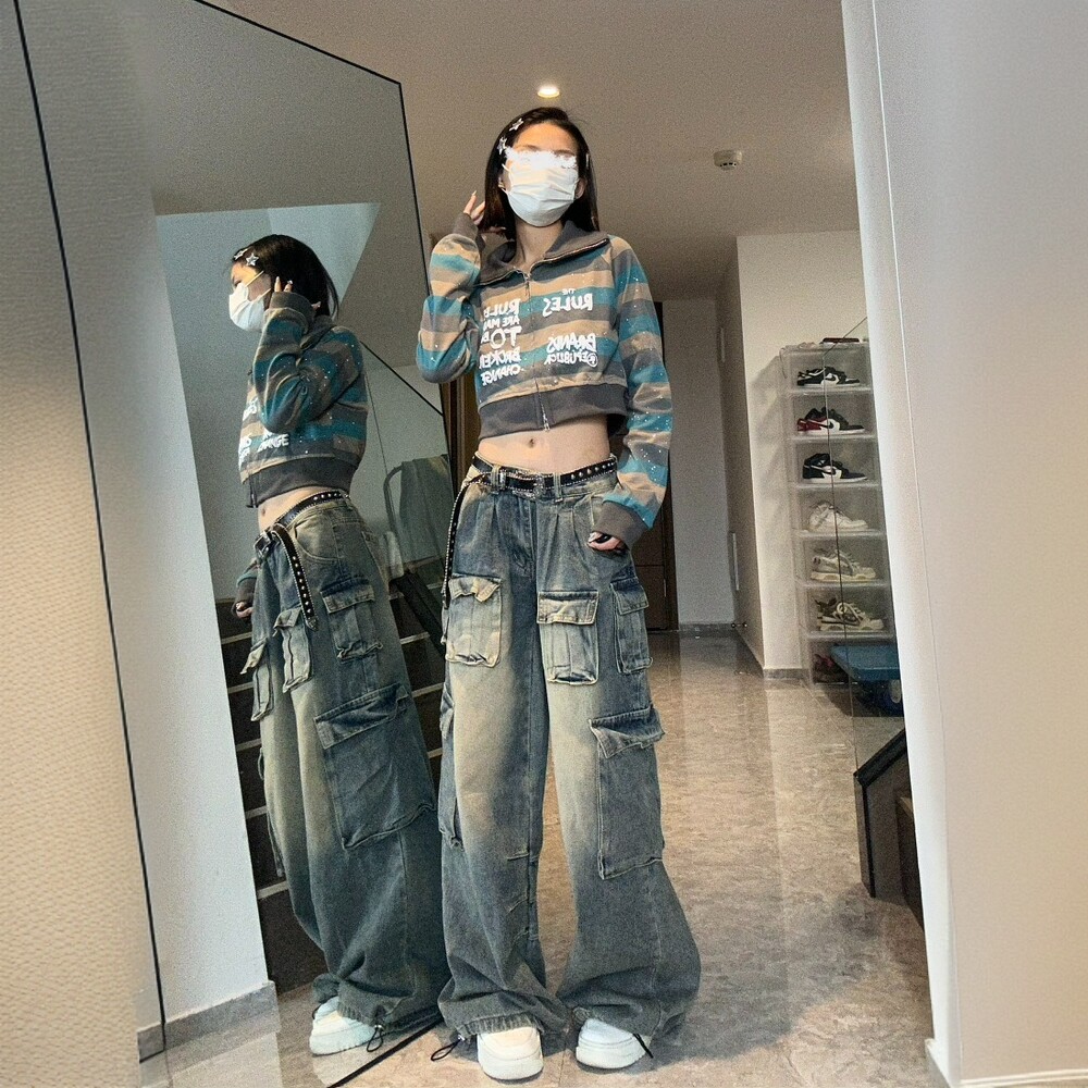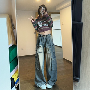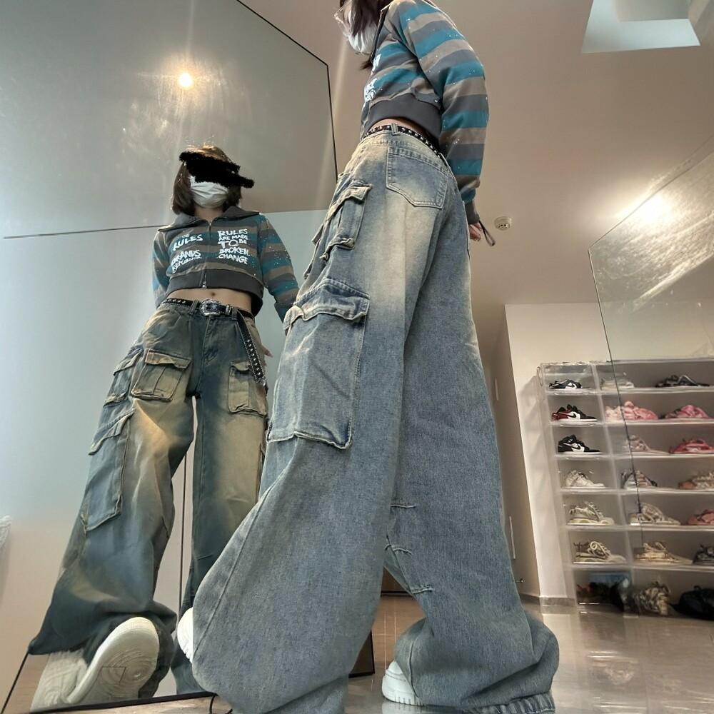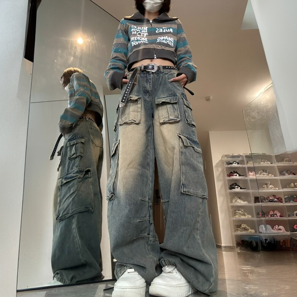 女胖mm高腰显瘦多口袋阔腿长裤 牛仔裤 高街vibe辣妹工装 300斤大码
