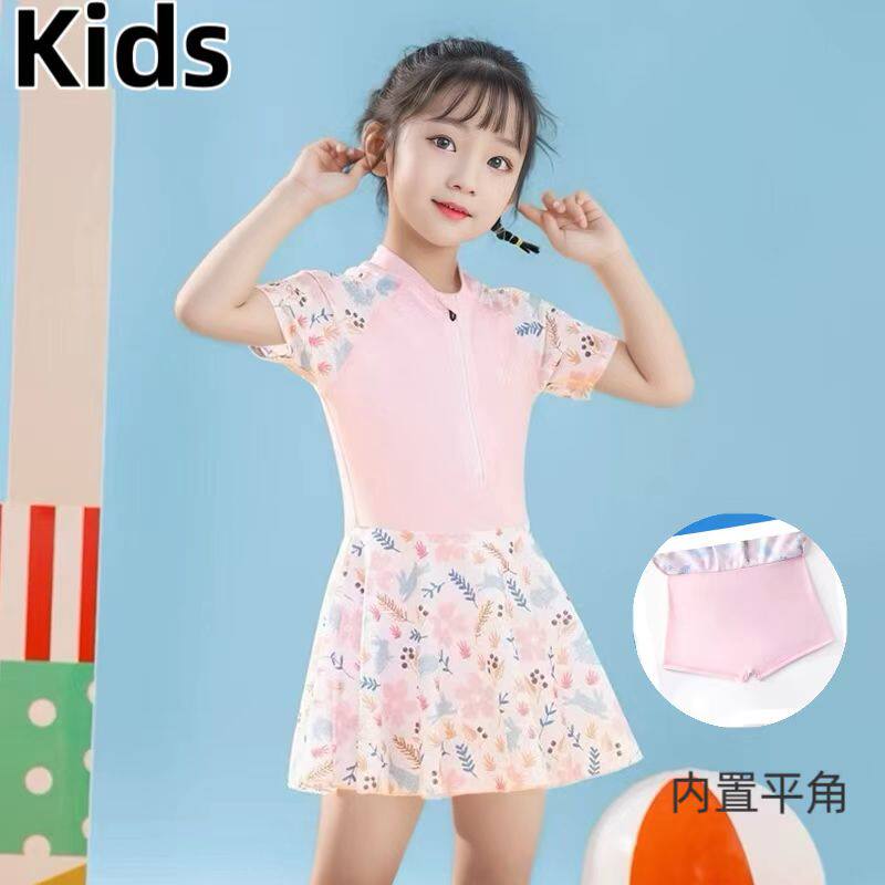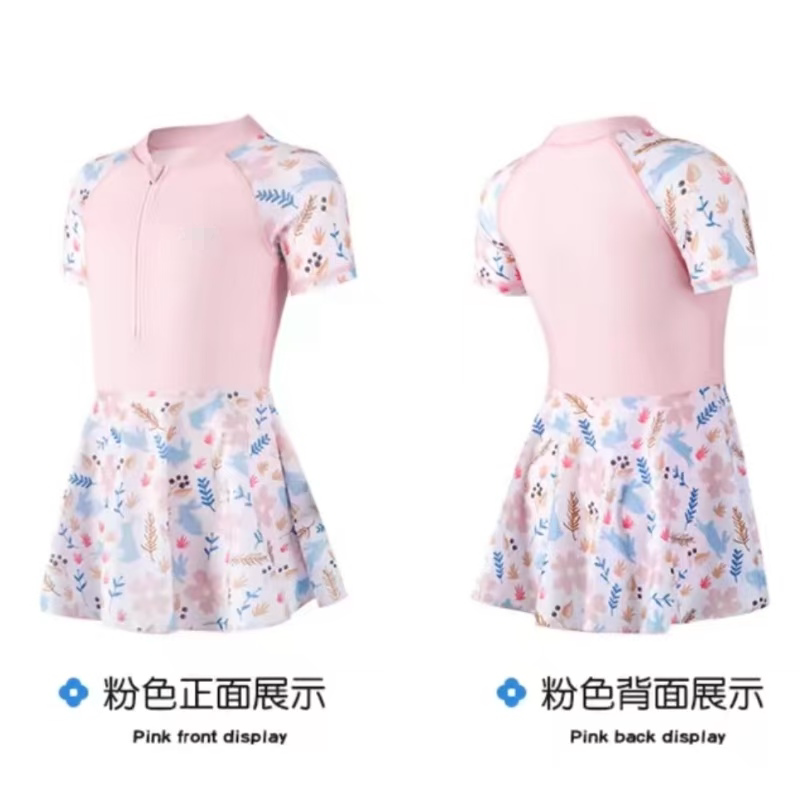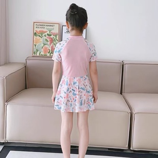Amber儿童游泳衣女童短袖 连体女孩小公主连衣裙沙滩小中大童 裙式