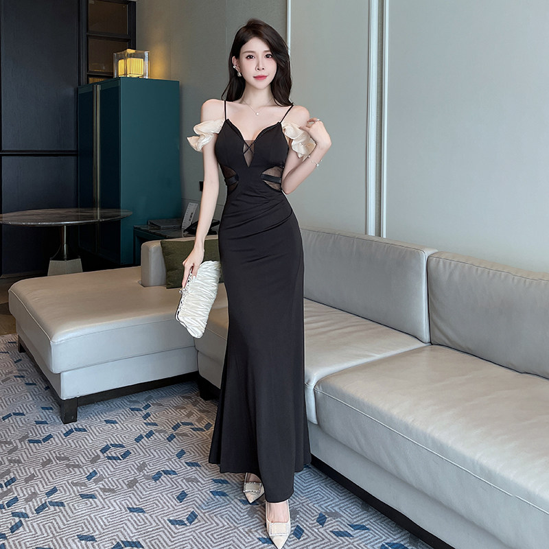 性感气质修身 连衣裙女秋季 针织长裙 黑色U领网纱拼接长袖 instahot