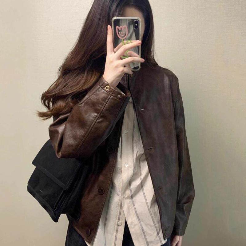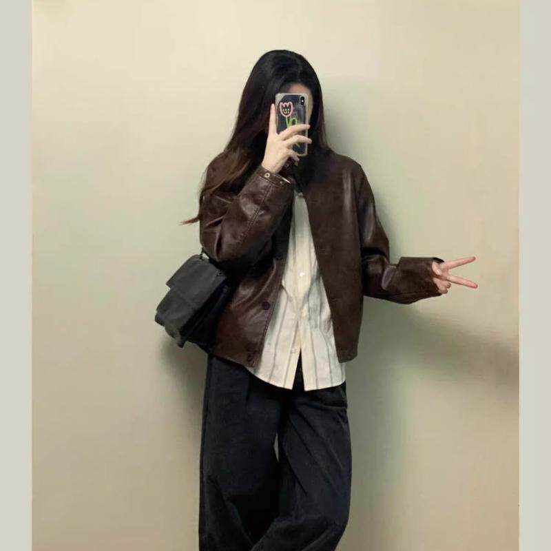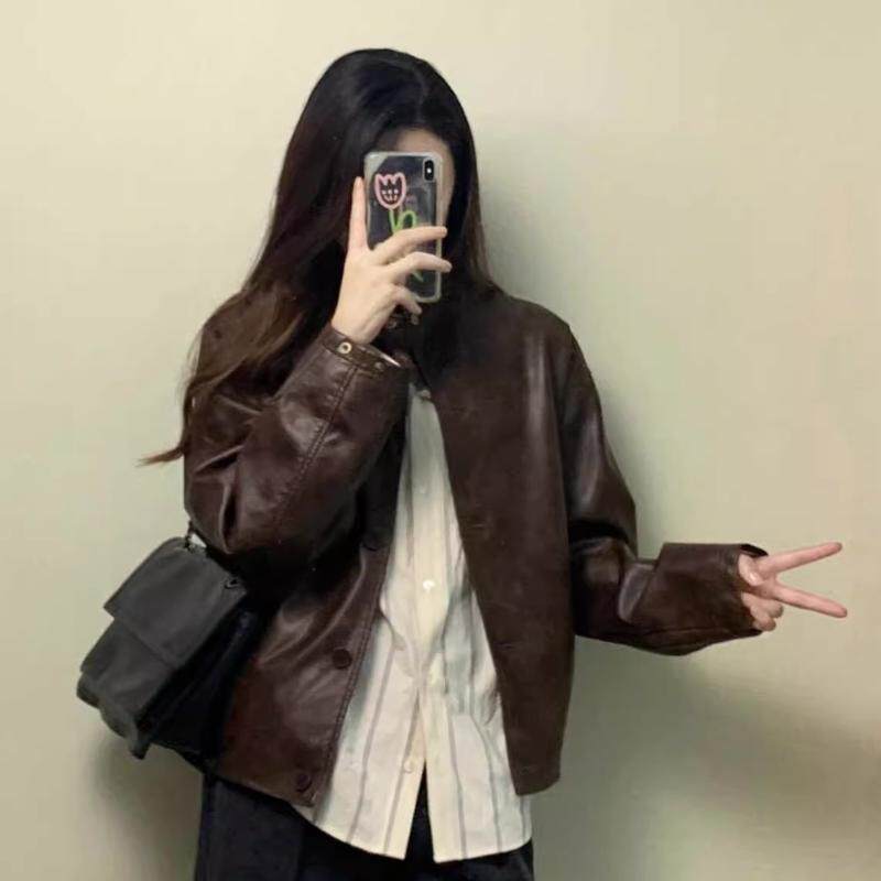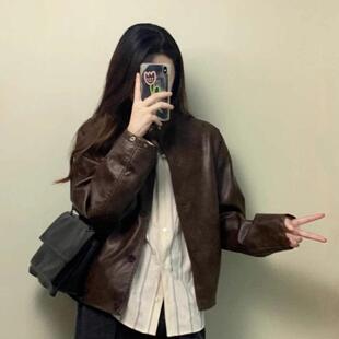 2025秋冬新款 皮衣外套女 小个子韩系立领机车服夹克美拉德棕色短款