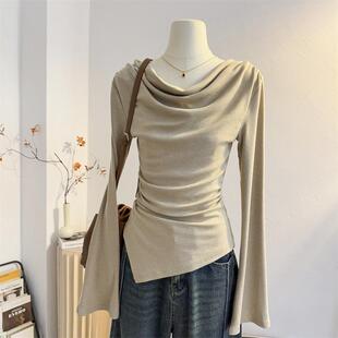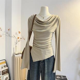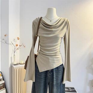 露肩一字肩上衣 打底衫 褶皱设计感不规则荡领长袖 T恤2025春秋修身