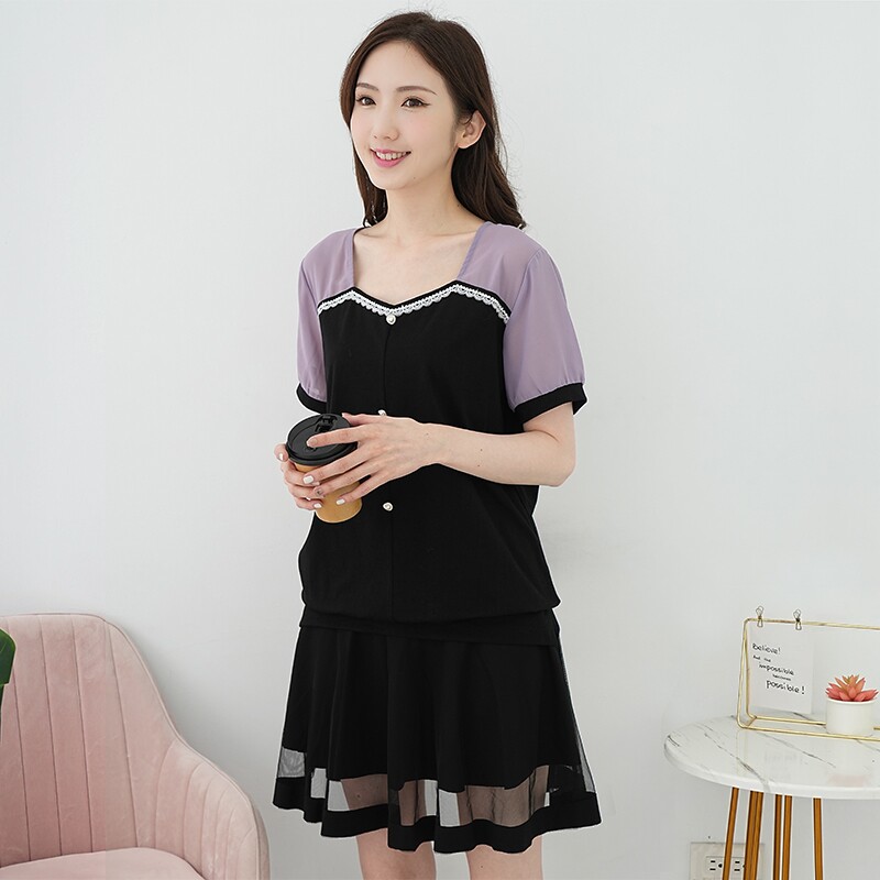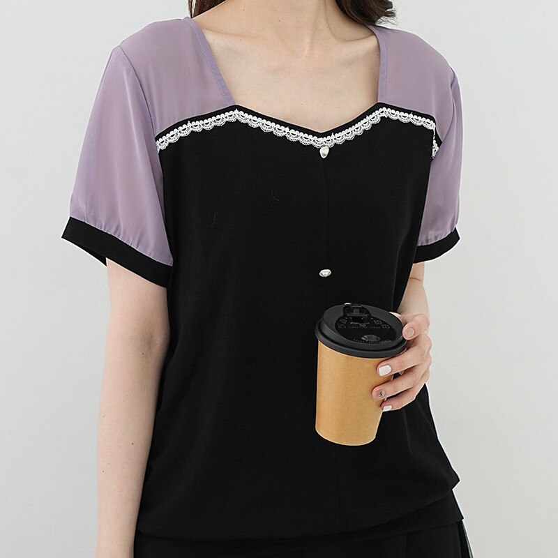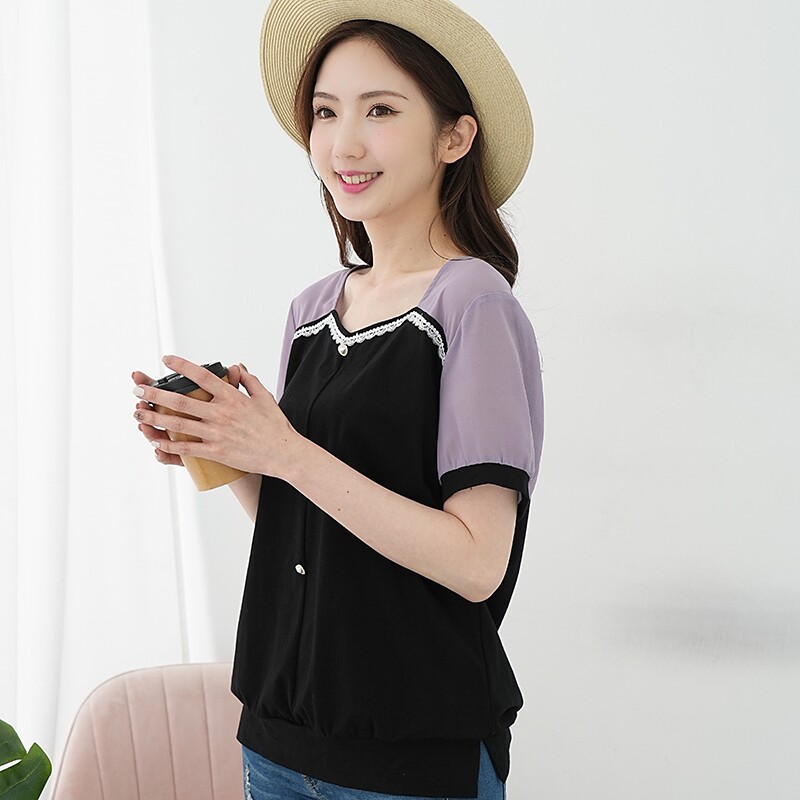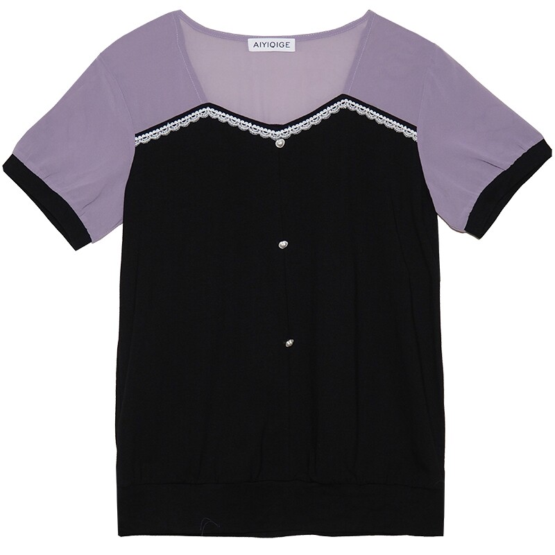 胖妹妹夏装 艾依琪格特大码 方领拼接蕾丝套头短袖 上衣法式 胖mm新款