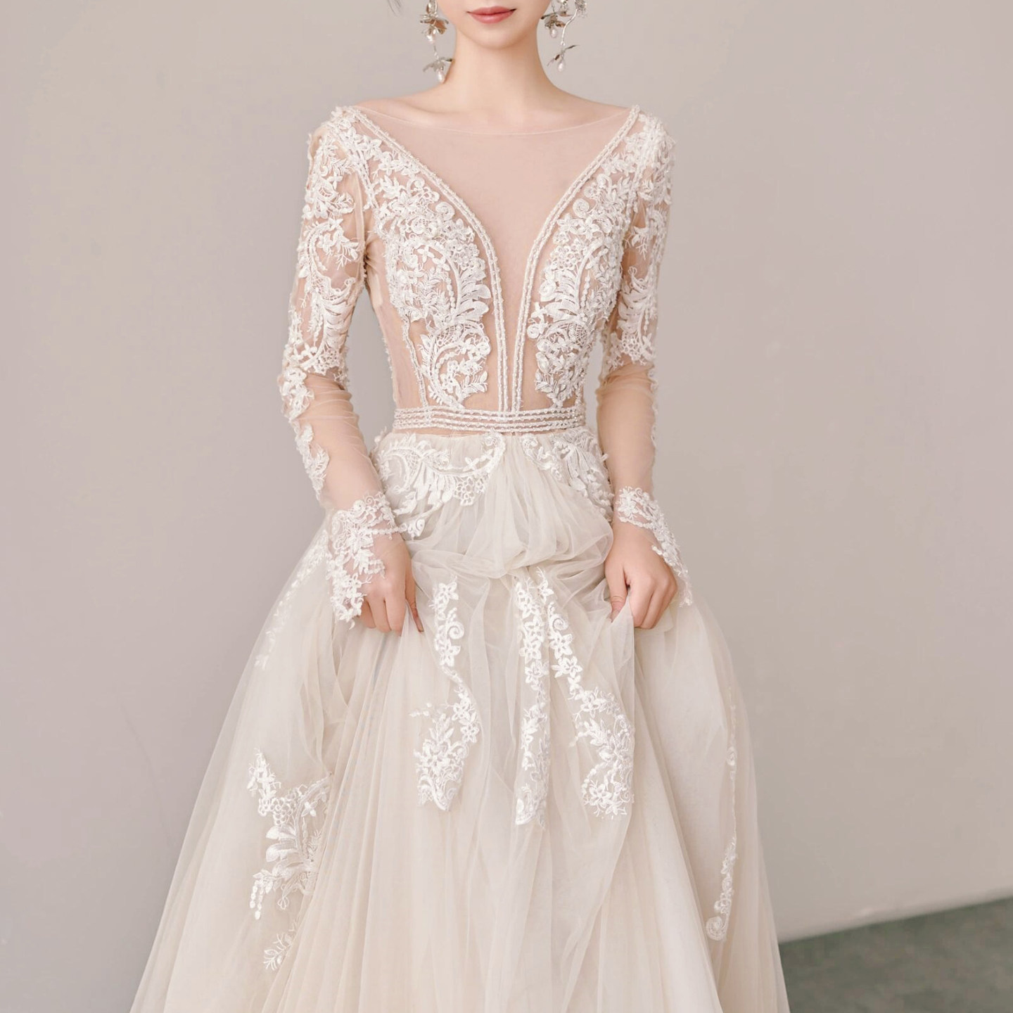 法式 蕾丝出门纱超仙森系拖尾重工小个子 V领轻婚纱新娘高级感长袖