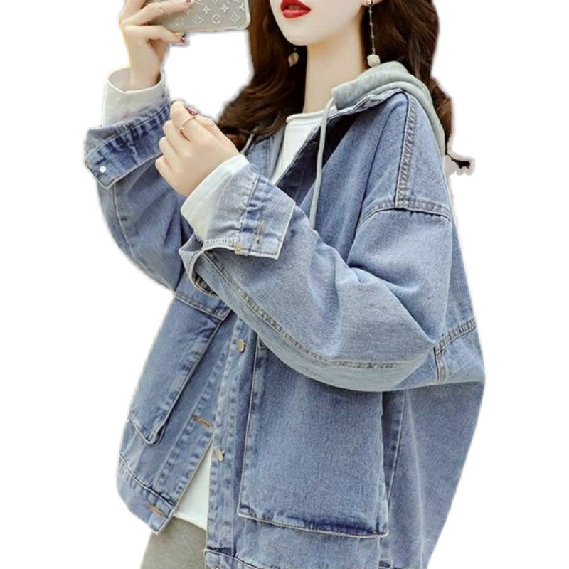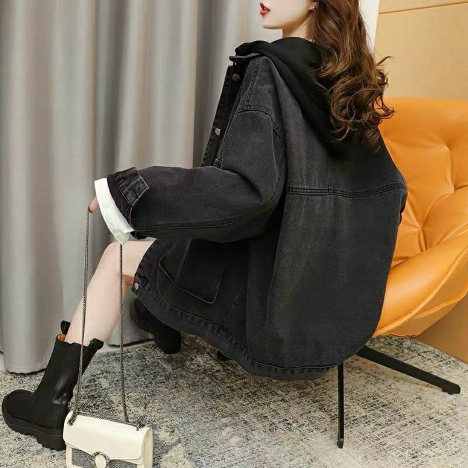 复古学生夹克牛仔宽松上衣 减龄百搭大码 韩版 宽松连帽外套女春秋季