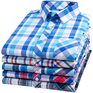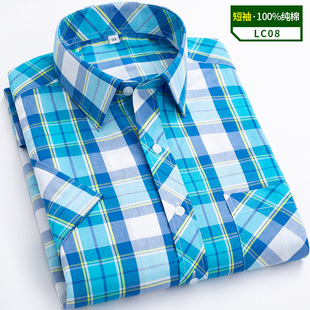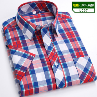 薄款 半袖 纯棉格子短袖 男中年宽松全棉加肥加大码 衬衣 衬衫 保罗夏季