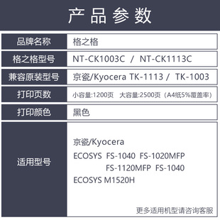 1113 1060 tk1003粉盒1020 1120MFP墨盒1040碳粉1025 1128打印机1125碳粉盒 m1520h硒鼓FS 格之格适用京瓷TK