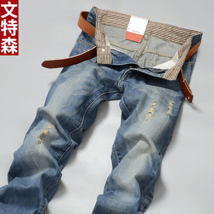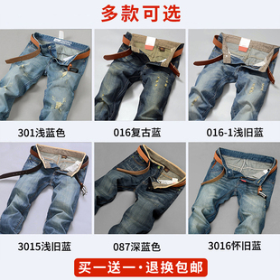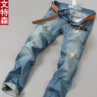 男裤 加绒宽松休闲青年潮牌乞丐裤 潮 男直筒修身 秋冬浅色破洞牛仔裤