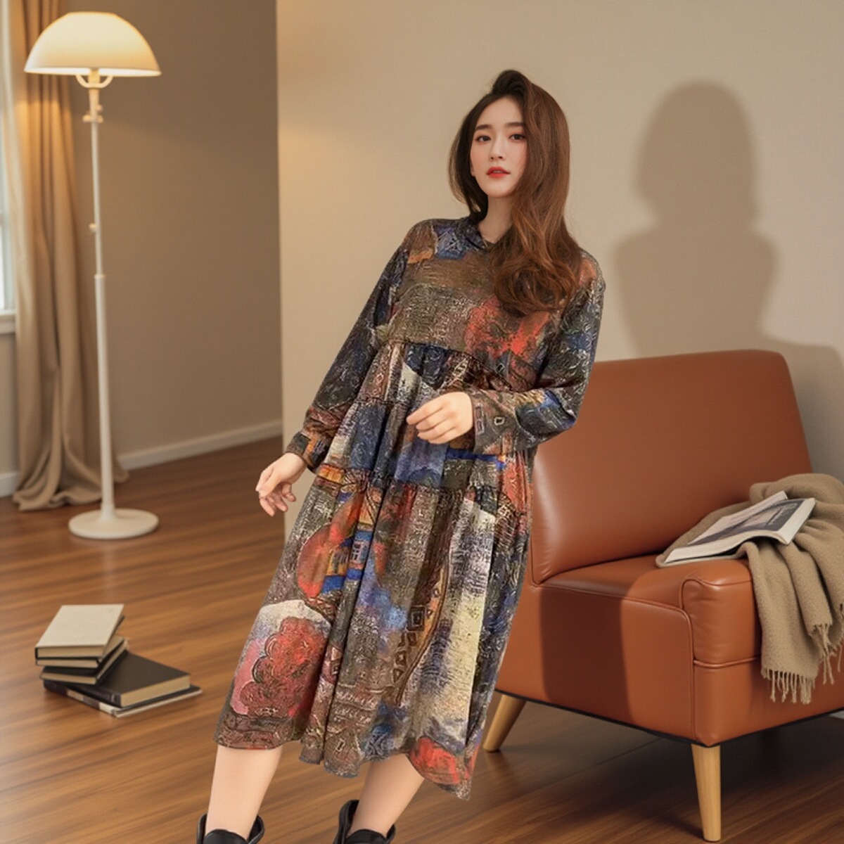 慵懒风碎花连衣裙女中长款 层次感设计宽松连帽大摆裙气质保暖时尚