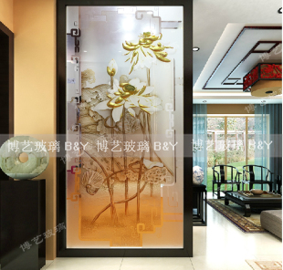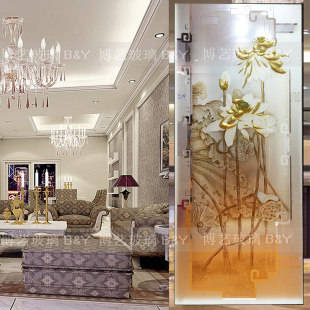 艺术玻璃背景墙简欧现代风格 玄关荷花立体深雕金箔超白玻璃隔断