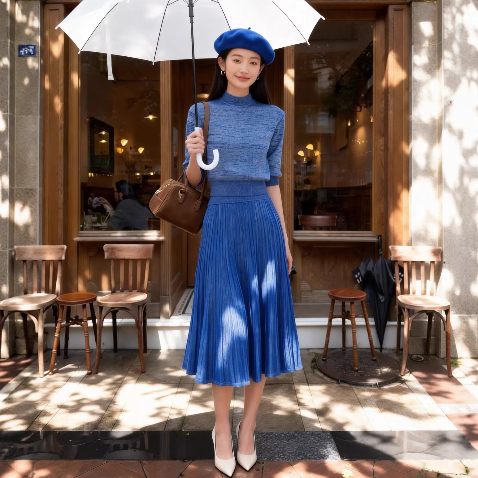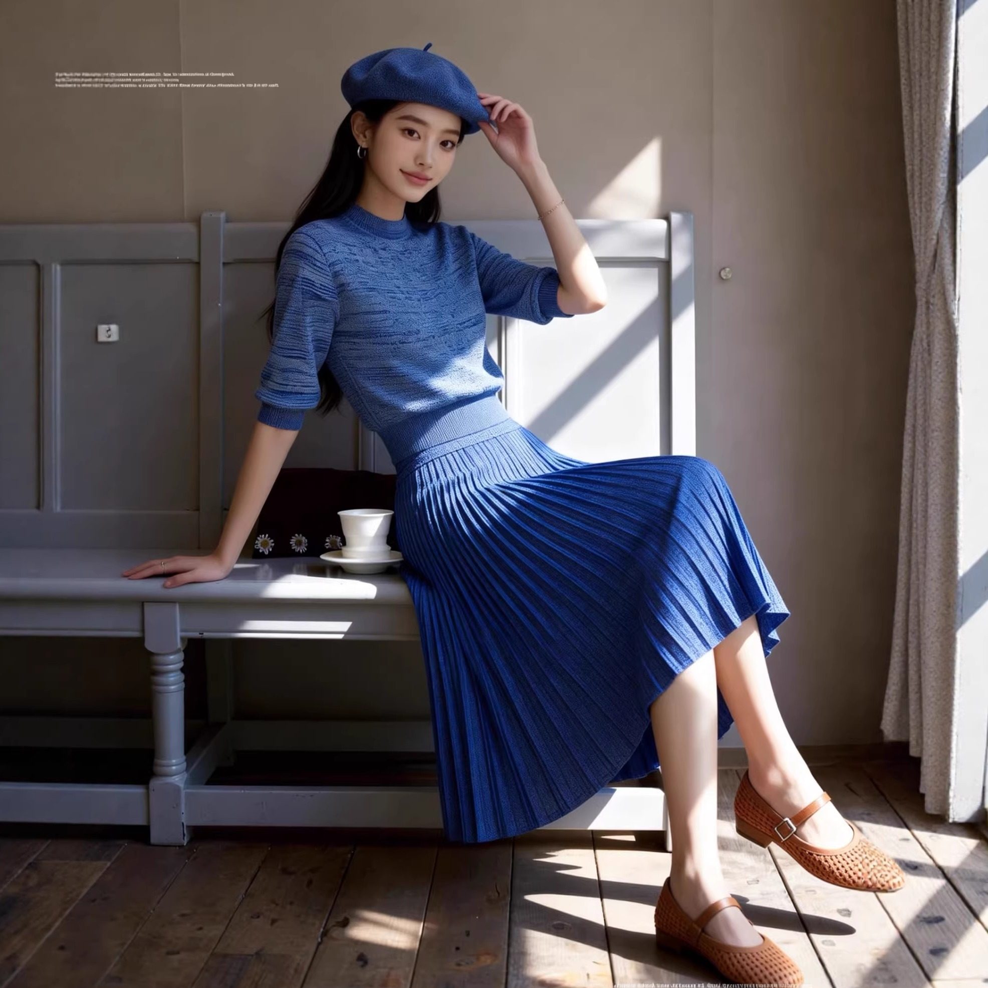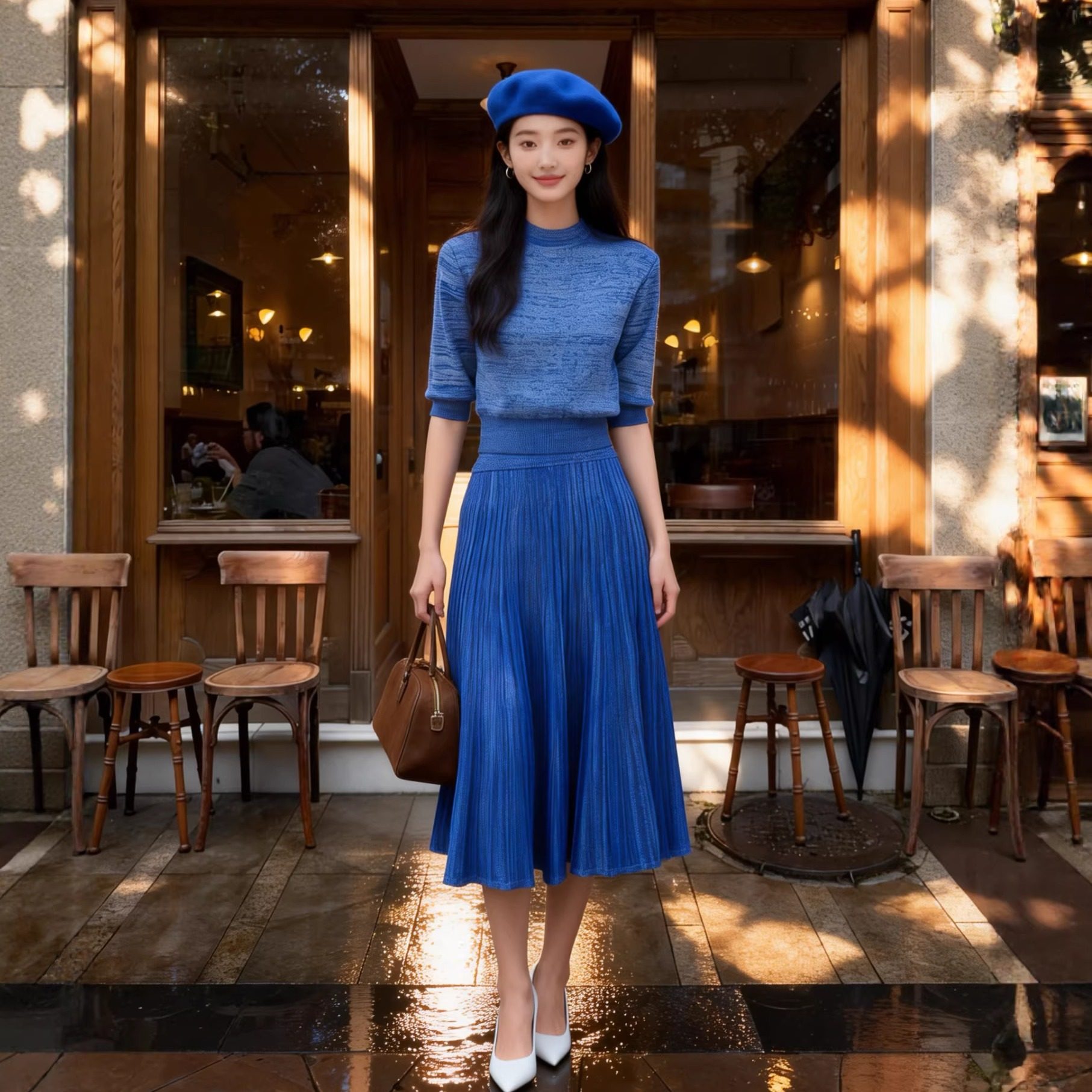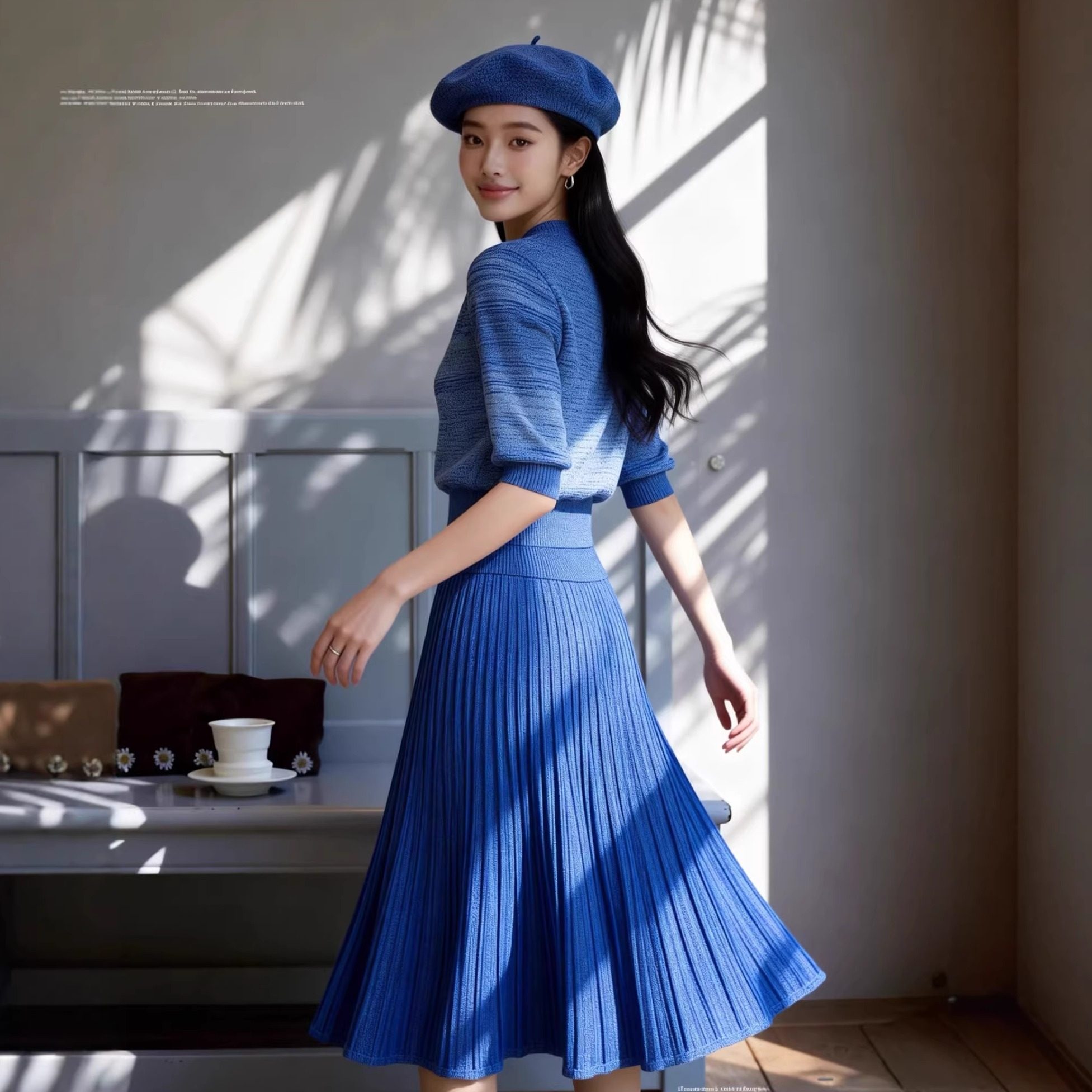 百褶裙子 年会宴会生日蓝色针织套裙显白毛衣 轻奢闪钻1838 新款